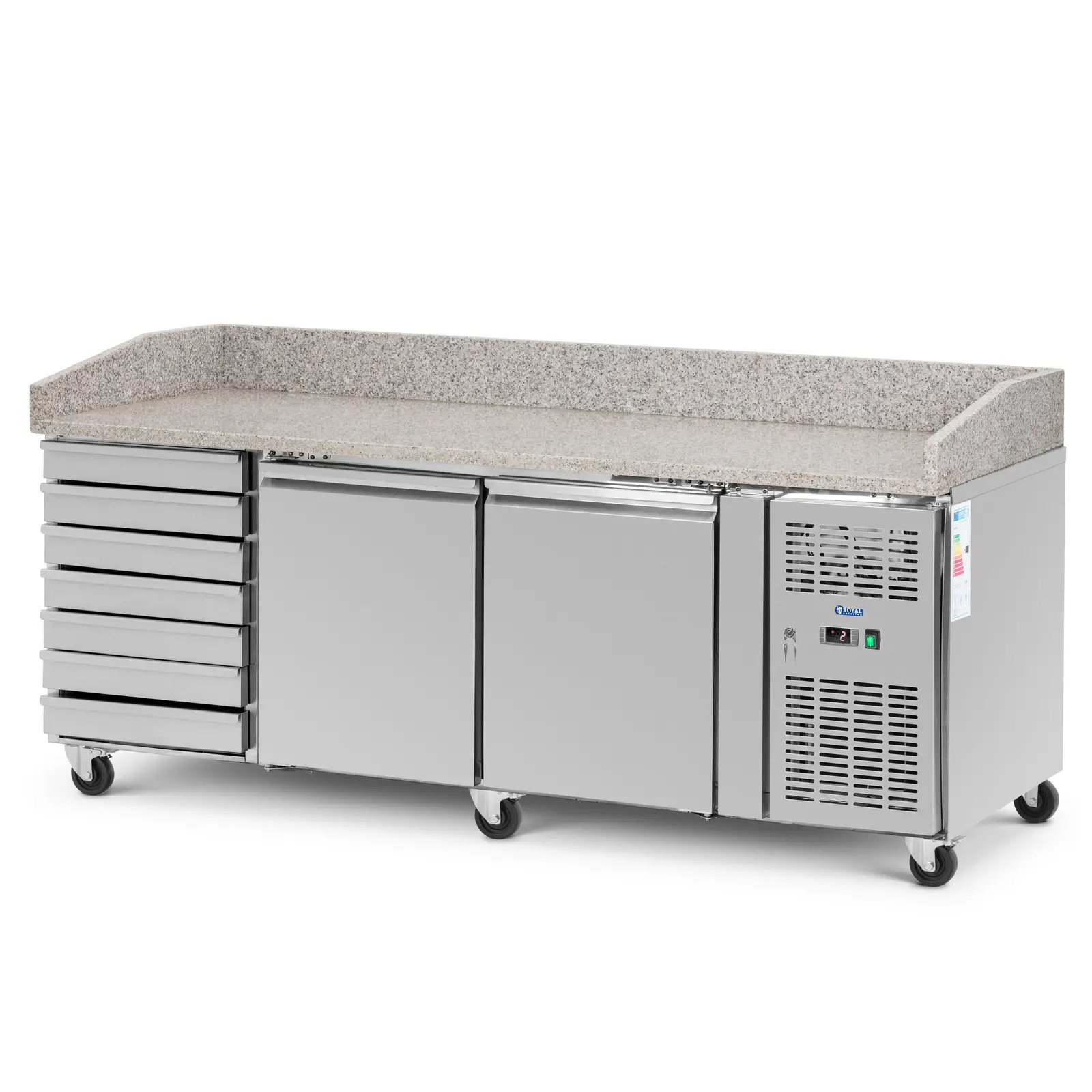 Royal Cateringin kylmäpöytä tekee tuoreiden ruokien käsittelystä tehokasta ja nopeaa. Suuri 390 litran tilavuus on yksi tämän mallin tärkeimmistä eduista. Lisäksi graniittisen työtason alla on seitsemän vetolaatikkoa ja kaksi tilavaa jäähdytyslokeroa, jotka voit jakaa korkeussäädettävillä hyllyillä. Kahden saranoidun oven sulava avaus- ja sulkumekanismi helpottaa niiden käsittelyä ravintoloiden hektisessä arjessa myös silloin, kun kätesi eivät ole vapaina. Kylmälaatikoston lämpötila-alue on 2 – 8 °C. Voit valita haluamasi lämpötilan intuitiiviselta elektroniselta näytöltä, jolta voit myös tarkistaa ajantasaisen lämpötilan. Jäähdytyspöydän avulla voit säilyttää tuotteet oikeassa lämpötilassa tai valmistella niitä suoraan 202 x 80 cm:n kokoisella graniittityötasolla. Tämä malli toimii erittäin energiatehokkaasti paksun eristyksen ja ympäristöystävällisen R290-kylmäaineen ansiosta. Kylmäpöydän ovi on lukittava. Kylmätiski sisältää myös automaattisen sulatustoiminnon, joka vähentää energiakustannuksia ja työaikaa. Lisäksi tiski tekee myös vaikutuksen energiatehokkuusluokalla B. Tämä ammattimainen kylmälaite sisältää neljä vankkarakenteista pyörää, jotka rullaavat sujuvasti myös epätasaisilla pinnoilla. Kahdella seisontajarrulla voit lukita pyörät heti, kun kylmätiski on haluamassasi paikassa. Sen kotelo on valmistettu korkealaatuisesta ruostumattomasta teräksestä. Materiaali on biologisesti inerttiä, eikä siten reagoi joutuessaan kosketuksiin ruokien kanssa, mikä tekee siitä elintarviketurvallisen valinnan. Lisäksi se on erityisen helppohoitoinen, pitkäikäinen ja korroosionkestävä materiaali.