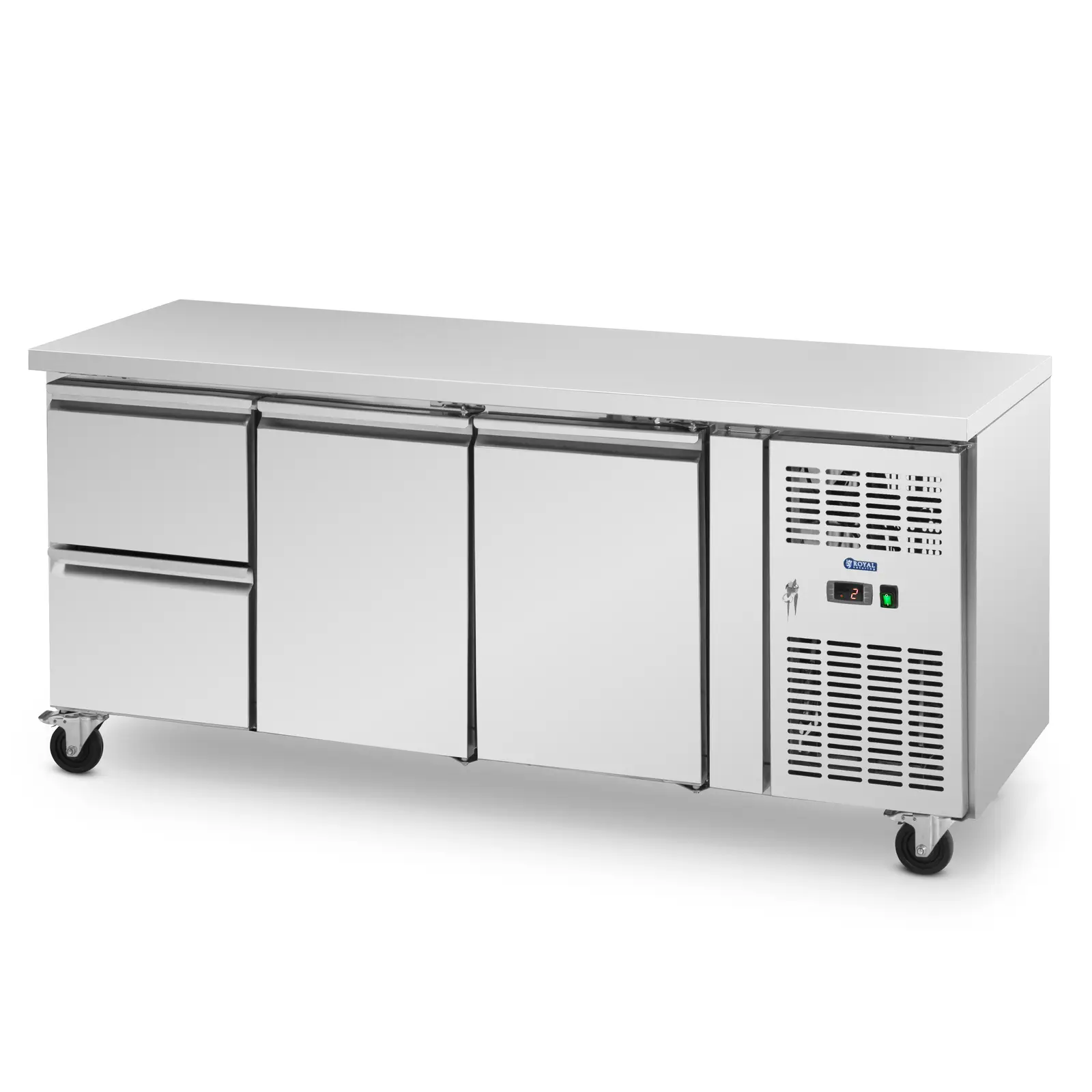 Royal Cateringin kylmäpöytä tekee tuoreiden ruokien käsittelystä tehokasta ja nopeaa. Ammattikäyttöön tarkoitettu kylmälaite soveltuu ravintola- ja hotellikäyttöön, mutta myös salaattibaareihin ja pikaruokaloihin. Tämä ravintolatason kylmäpöytä on erityisen helppo siirtää haluttuun paikkaan. Se sisältää neljä vankkarakenteista pyörää, jotka rullaavat sujuvasti myös epätasaisilla pinnoilla. Kahdella seisontajarrulla voit lukita renkaat, kun olet saanut kylmätiskin oikeaan asentoon. Suuri 410 litran tilavuus on yksi tämän mallin tärkeimmistä eduista. Sen työtason alla on kaksi vetolaatikkoa ja kaksi lokeroa, joissa kummassakin on yksi hyllytaso. Sulava avaus- ja sulkeutumismekanismi helpottaa niiden käsittelyä ravintoloiden hektisessä arjessa myös silloin, kun kätesi eivät ole vapaina. Jäähdytyspöytä voidaan myös lukita, joten voit varastoida siinä luotettavasti myös arvokkaampia raaka-aineita. Kylmäpöydän lämpötila-alue on 2 – 8 °C. Voit valita haluamasi lämpötilan intuitiiviselta, digitaaliselta ohjauspaneelilta, jolta voit myös tarkistaa ajantasaisen lämpötilan. Jäähdytystiski tekee vaikutuksen energialuokalla B ja toimii konvektiojäähdytyksellä. Näin lämpötila pysyy aina tasaisena kaikissa sen osissa. Edes tiskin vetolaatikkojen ja ovien jatkuva käyttö ei aiheuta sen sisätilojen liiallista lämpenemistä, sillä ulkoinen jäähdytysjärjestelmä puhaltaa sinne jatkuvasti uutta viileää ilmaa. Tämä malli toimii erittäin taloudellisesti 6 cm paksun eristyksen ja ympäristöystävällisen R290-kylmäaineen ansiosta. Kylmätiski sisältää myös automaattisen sulatustoiminnon, joka vähentää energiakustannuksia ja työaikaa. Suuri ruostumattomasta teräksestä valmistettu 179,5 x 70 cm:n kokoinen työtaso tarjoaa runsaasti tilaa erilaisten ainesosien käsittelyyn. Lisäksi kylmäpöydän runko on valmistettu korkealaatuisesta ruostumattomasta teräksestä. Materiaali on biologisesti inerttiä, eikä siten reagoi joutuessaan kosketuksiin ruokien kanssa, mikä tekee siitä elintarviketurvallisen valinnan. Se on myös erityisen pitkäikäinen ja korroosionkestävä materiaali. Voit puhdistaa pöydän pinnat nopeasti ja perusteellisesti niiden matalan huokoisuuden ansiosta.