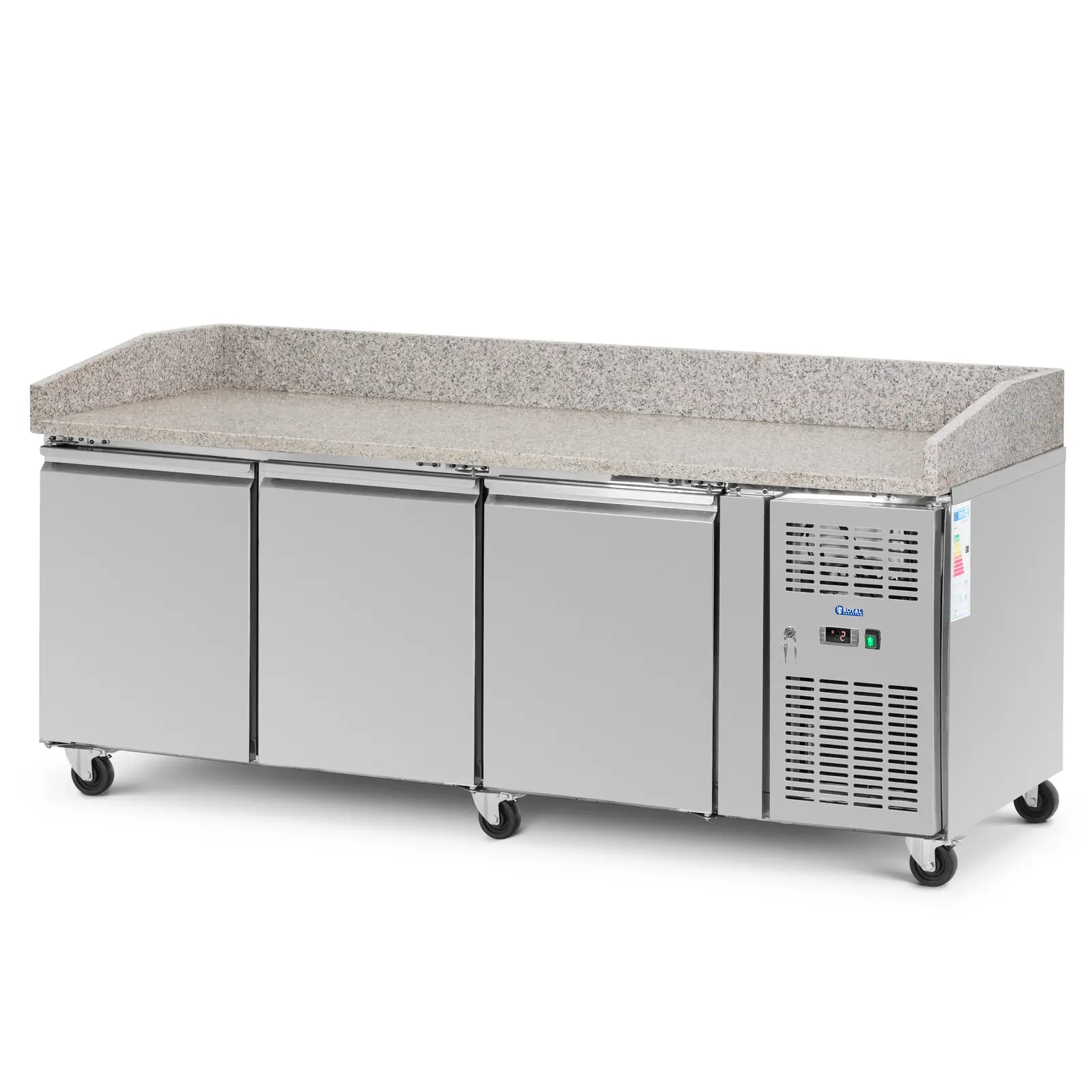 Royal Cateringin kylmäpöytä tekee tuoreiden ruokien käsittelystä tehokasta ja nopeaa. Suuri 560 litran tilavuus on yksi tämän mallin tärkeimmistä eduista. Lisäksi graniitista valmistetun työtason alla on kolme tilavaa jäähdytyslokeroa, jotka voit jakaa korkeussäädettävillä hyllyillä. Saranoitujen ovien sulava avaus- ja sulkeutumismekanismi helpottaa niiden käsittelyä ravintoloiden hektisessä arjessa myös silloin, kun sinulla ei ole käsiä vapaana. Kylmälaatikoston lämpötila-alue on 2 – 8 °C. Voit valita haluamasi lämpötilan intuitiiviselta elektroniselta näytöltä, jolta voit myös tarkistaa ajantasaisen lämpötilan. Jäähdytyspöydän avulla voit säilyttää tuotteet oikeassa lämpötilassa tai valmistella niitä suoraan 202 x 80 cm:n kokoisella graniittityötasolla. Tämä malli toimii erittäin energiatehokkaasti paksun eristyksen ja ympäristöystävällisen R290-kylmäaineen ansiosta. Kylmäpöydän ovi on lukittava. Kylmätiski sisältää myös automaattisen sulatustoiminnon, joka vähentää energiakustannuksia ja työaikaa. Tämä ammattimainen kylmälaite sisältää kuusi vankkarakenteista pyörää, jotka rullaavat sujuvasti myös epätasaisilla pinnoilla. Kahdella seisontajarrulla voit lukita pyörät heti, kun kylmätiski on haluamassasi paikassa. Sen kotelo on valmistettu korkealaatuisesta ruostumattomasta teräksestä. Materiaali on biologisesti inerttiä, eikä siten reagoi joutuessaan kosketuksiin ruokien kanssa, mikä tekee siitä elintarviketurvallisen valinnan. Lisäksi se on erityisen helppohoitoinen, pitkäikäinen ja korroosionkestävä materiaali.
