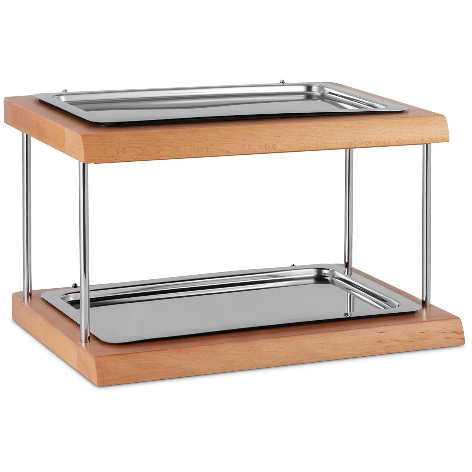 Onko sinulla pitopalvelu, kahvila tai ravintola ja etsit tyylikästä ratkaisua tuoreen ruoan esillepanoon buffetissa tai näyteikkunoissa? Tällöin tarvitset APS:n kylmätarjottimen APS-11541! Ruokasi pidetään viileänä tuntikausia ja esillä täydellisesti koko päivän! Kylmäakut sijoitetaan puulaatikoiden sisään. Ruostumattomasta teräksestä valmistetut tarjottimet asetetaan päälle niin, että akut peittyvät. Tämä muotoilu antaa tarjottimelle modernin ja tyylikkään ilmeen, joka sopii täydellisesti mihin tahansa tilanteeseen.