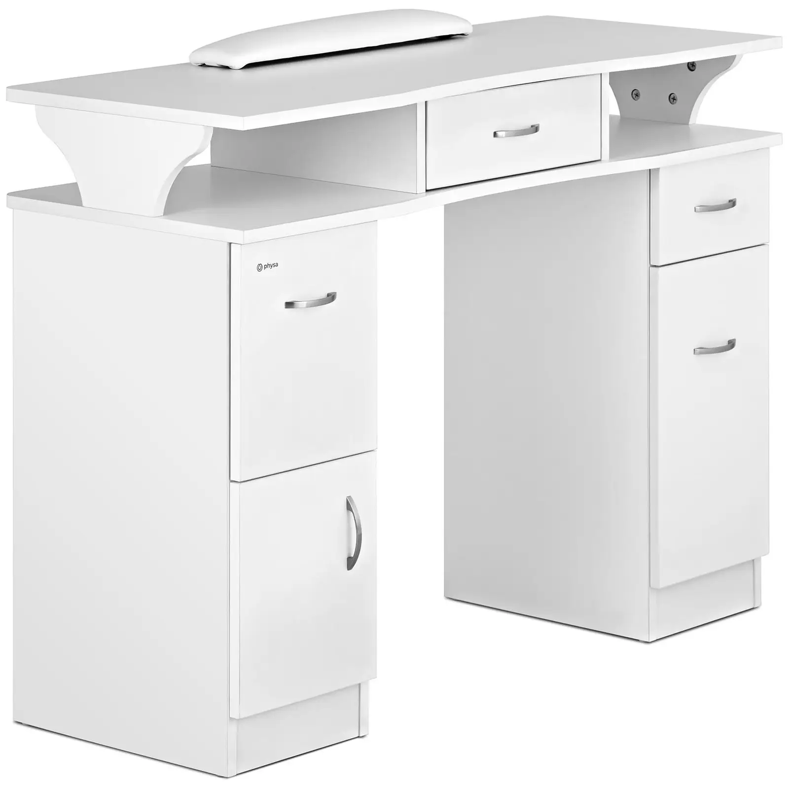 Toivota asiakkaasi tervetulleiksi kynsistudioon, kylpylään tai kauneushoitolaasi ja luo ammattimainen ja tyylikäs vaikutelma: Physan PHY-MT-6-kynsipöydällä voit käsitellä ja lakata kynsiä asiakkaita ilahduttavin täydellisin tuloksin. Kynsipöydän huolella harkitut lisävarusteet ja tyylikäs ulkomuoto vakuuttavat niin esteettisyydellä kuin käytännöllisyydelläänkin. Hillitty mustavalkoinen värimaailma tekee kynsipöydästä tyylikkään katseenvangitsijan. 103,7 x 40,8 cm kokoisesta pöytätasosta löytyy tarpeeksi tilaa miellyttävään työskentelyyn. Kaikkia työtarvikkeita voidaan säilyttää järjestelmällisesti kolmessa laatikossa ja muilla säilytystasoilla, minkä ansiosta saadaan aikaan siisti ja hygieeninen vaikutelma milloin tahansa. Tämä monipuolinen kynsipöytä soveltuu niin klassista manikyyria, kynsien mallintamista kuin tavallisia toimistotöitäkin varten. Sileät pinnat ja pelkistetty muotoilu tekevät pöydästä nopean ja vaivattoman puhdistettavan, mikä on korvaamaton etu erityisesti kynsistudioissa. MDF: stä valmistettu kestävä ja laadukas kynsipöytä melamiinihartsipinnoitteella vastaa kaikkiin kynsihoitolan arjen haasteisiin ja vakuuttaa pitkällä käyttöiällä ja virheettömällä ulkomuodollaan.