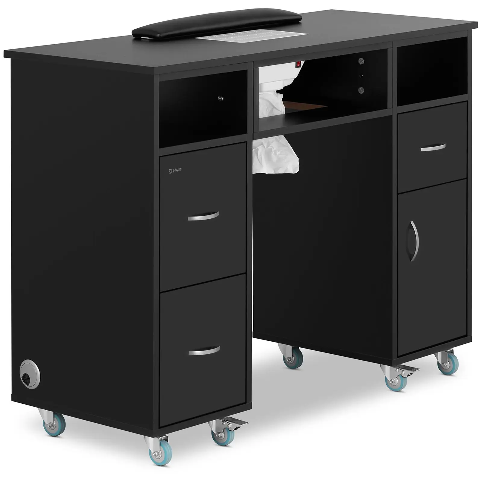 Toivota asiakkaasi tervetulleiksi kynsistudioon, kylpylään tai kauneushoitolaasi ja luo ammattimainen ja tyylikäs vaikutelma: Physan PHY-MT-8-kynsipöydällä voit käsitellä ja lakata kynsiä asiakkaita ilahduttavin täydellisin tuloksin. Kynsipöydän huolella harkitut lisävarusteet ja tyylikäs ulkomuoto vakuuttavat niin esteettisyydellä kuin käytännöllisyydelläänkin. Hillitty musta värimaailma tekee kynsipöydästä tyylikkään katseenvangitsijan. 120 x 42 cm kokoisesta pöytätasosta löytyy tarpeeksi tilaa miellyttävään työskentelyyn. Kaikkia työtarvikkeita voidaan säilyttää järjestelmällisesti kolmessa laatikossa ja muilla säilytystasoilla, minkä ansiosta saadaan aikaan siisti ja hygieeninen vaikutelma milloin tahansa. Tämä monipuolinen kynsipöytä soveltuu niin klassista manikyyria, kynsien mallintamista kuin tavallisia toimistotöitäkin varten. Lisäjoustavuutta tarjoaa pöydän kahdeksan helposti liikuteltavaa muovipyörää – kaksi niistä on varustettu jarrulla tarvittavan vakauden varmistamiseksi. Tämä liikkuvuus mahdollistaa työtilojen optimoidun käytön. Integroitu imujärjestelmä, sileät pinnat ja pelkistetty muotoilu tekevät pöydästä nopean ja vaivattoman puhdistettavan, mikä on korvaamaton etu erityisesti kynsistudioissa. Laadukkaasti viimeistelty kynsipöytä kestävistä materiaaleista vastaa kaikkiin kynsihoitolan arjen haasteisiin ja vakuuttaa pitkällä käyttöiällä ja virheettömällä ulkomuodollaan.