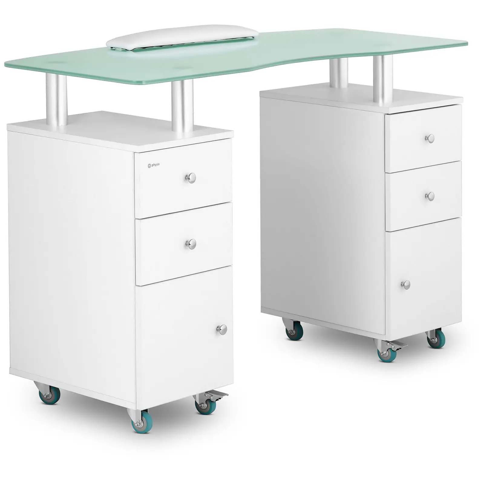 Toivota asiakkaasi tervetulleiksi kynsistudioon, kylpylään tai kauneushoitolaasi ja luo ammattimainen ja tyylikäs vaikutelma: Physan PHY-MT-4-kynsipöydällä voit käsitellä ja lakata kynsiä asiakkaita ilahduttavin täydellisin tuloksin. Kynsipöydän huolella harkitut lisävarusteet ja tyylikäs ulkomuoto vakuuttavat niin esteettisyydellä kuin käytännöllisyydelläänkin. Hillitty matta valkoinen värimaailma tekee kynsipöydästä tyylikkään katseenvangitsijan. 120 x 51,5 cm kokoisesta pöytätasosta löytyy tarpeeksi tilaa miellyttävään työskentelyyn. Kaikkia työtarvikkeita voidaan säilyttää järjestelmällisesti neljässä laatikossa ja muilla säilytystasoilla, minkä ansiosta saadaan aikaan siisti ja hygieeninen vaikutelma milloin tahansa. Tämä monipuolinen kynsipöytä soveltuu niin klassista manikyyria, kynsien mallintamista kuin tavallisia toimistotöitäkin varten. Lisäjoustavuutta tarjoaa pöydän kahdeksan helposti liikuteltavaa muovipyörää – kaksi niistä on varustettu jarrulla tarvittavan vakauden varmistamiseksi. Tämä liikkuvuus mahdollistaa työtilojen optimoidun käytön. Sileät pinnat ja pelkistetty muotoilu tekevät pöydästä nopean ja vaivattoman puhdistettavan, mikä on korvaamaton etu erityisesti kynsistudioissa. Laadukkaasti viimeistelty kynsipöytä kestävistä materiaaleista vastaa kaikkiin kynsihoitolan arjen haasteisiin ja vakuuttaa pitkällä käyttöiällä ja virheettömällä ulkomuodollaan.