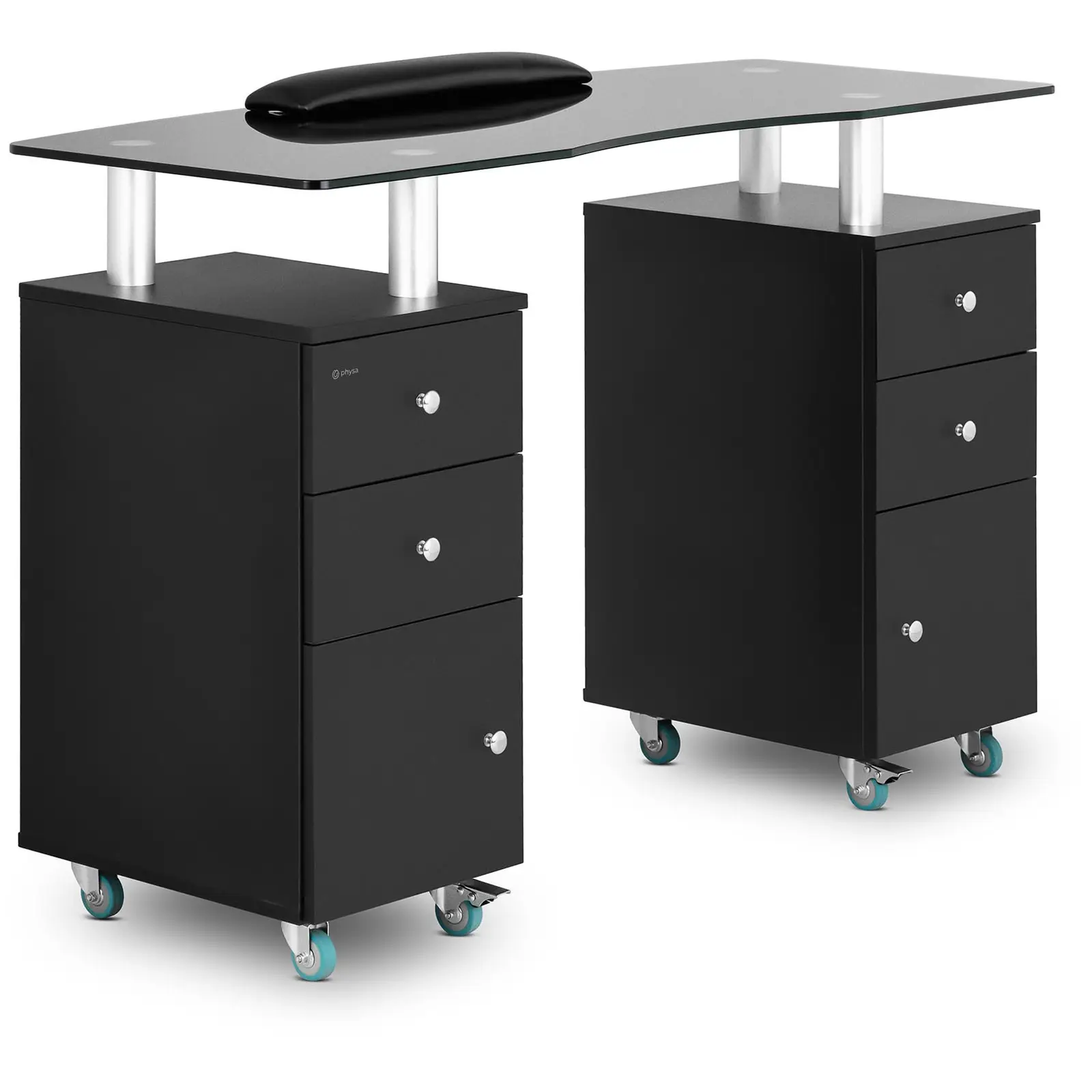 Toivota asiakkaasi tervetulleiksi kynsistudioon, kylpylään tai kauneushoitolaasi ja luo ammattimainen ja tyylikäs vaikutelma: Physan PHY-MT-5-kynsipöydällä voit käsitellä ja lakata kynsiä asiakkaita ilahduttavin täydellisin tuloksin. Kynsipöydän huolella harkitut lisävarusteet ja tyylikäs ulkomuoto vakuuttavat niin esteettisyydellä kuin käytännöllisyydelläänkin. Hillitty mustavalkoinen värimaailma tekee kynsipöydästä tyylikkään katseenvangitsijan. 120 x 51,5 cm kokoisesta pöytätasosta löytyy tarpeeksi tilaa miellyttävään työskentelyyn. Kaikkia työtarvikkeita voidaan säilyttää järjestelmällisesti neljässä laatikossa ja muilla säilytystasoilla, minkä ansiosta saadaan aikaan siisti ja hygieeninen vaikutelma milloin tahansa. Tämä monipuolinen kynsipöytä soveltuu niin klassista manikyyria, kynsien mallintamista kuin tavallisia toimistotöitäkin varten. Lisäjoustavuutta tarjoaa pöydän kahdeksan helposti liikuteltavaa muovipyörää – kaksi niistä on varustettu jarrulla tarvittavan vakauden varmistamiseksi. Tämä liikkuvuus mahdollistaa työtilojen optimoidun käytön. Sileät pinnat ja pelkistetty muotoilu tekevät pöydästä nopean ja vaivattoman puhdistettavan, mikä on korvaamaton etu erityisesti kynsistudioissa. Laadukkaasti viimeistelty kynsipöytä kestävistä materiaaleista vastaa kaikkiin kynsihoitolan arjen haasteisiin ja vakuuttaa pitkällä käyttöiällä ja virheettömällä ulkomuodollaan.