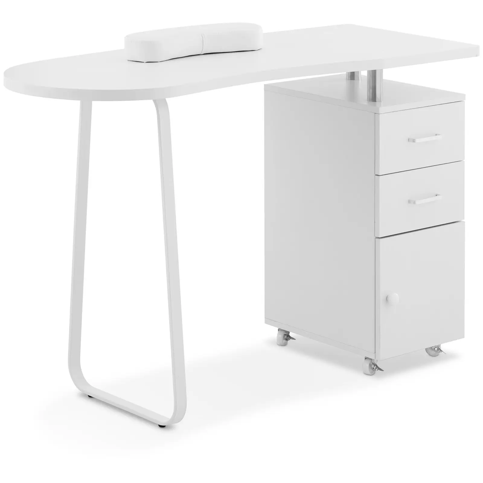 Toivota asiakkaasi tervetulleeksi kynsistudioon, kylpylään tai kauneushoitolaasi ammattimaisen tyylikkäällä tunnelmalla: physa PHY-MT-13lta mahdollistaa laadukkaat kynsihoidot, jotka ilahduttavat asiakkaitasi pitkään. Se myös tarjoaa sinulle riittävästi tilaa säilyttää kosmetiikkalaitteitasi selkeässä järjestyksessä ja mukavasti käden ulottuvilla. Kauneus ja terveys -kategoriastamme löytyvät physaan kauneushoitolaitteet tarjoavat sekä hienostunutta laatua että viehättävää muotoilua. Suuri pöytälevy tarjoaa runsaasti tilaa työskennellä mukavasti. kahden laatikon, lokeron ja pöydän toisella puolella olevan hyllyn ansiosta voit säilyttää kaikki välineesi selkeästi sekä ylläpitää siistiä ja hygieenistä työympäristöä. Pöydän toisella sivulla olevat jalat varmistavat sen vakauden. Toimitukseen kuuluvan käsityynyn ansiosta voit tarjota maksimaalista mukavuutta koko hoidoin ajan. Oli kyseessä sitten klassinen kynsihoito, muut manikyyripalvelut tai toimistotyöt: manikyyripöytä sopii moniin eri käyttötarkoituksiin. Sileiden pintojen ja kompaktin muotoilun ansiosta voit puhdistaa pöydän erittäin nopeasti – tämä on korvaamaton etu erityisesti kynsisalongeissa. Laadukkaalla työstöllä ja kestävällä MDF-levyllä varustettu kynsipöytä vastaa kaikkiin kauneushoitolan arjen haasteisiin ja vakuuttaa pitkällä käyttöiällä sekä virheettömällä ulkonäöllään. Lisäksi pöydän 4 pyörää auttavat sinua asettamaan sen sopivimmalle paikalle salongissasi.