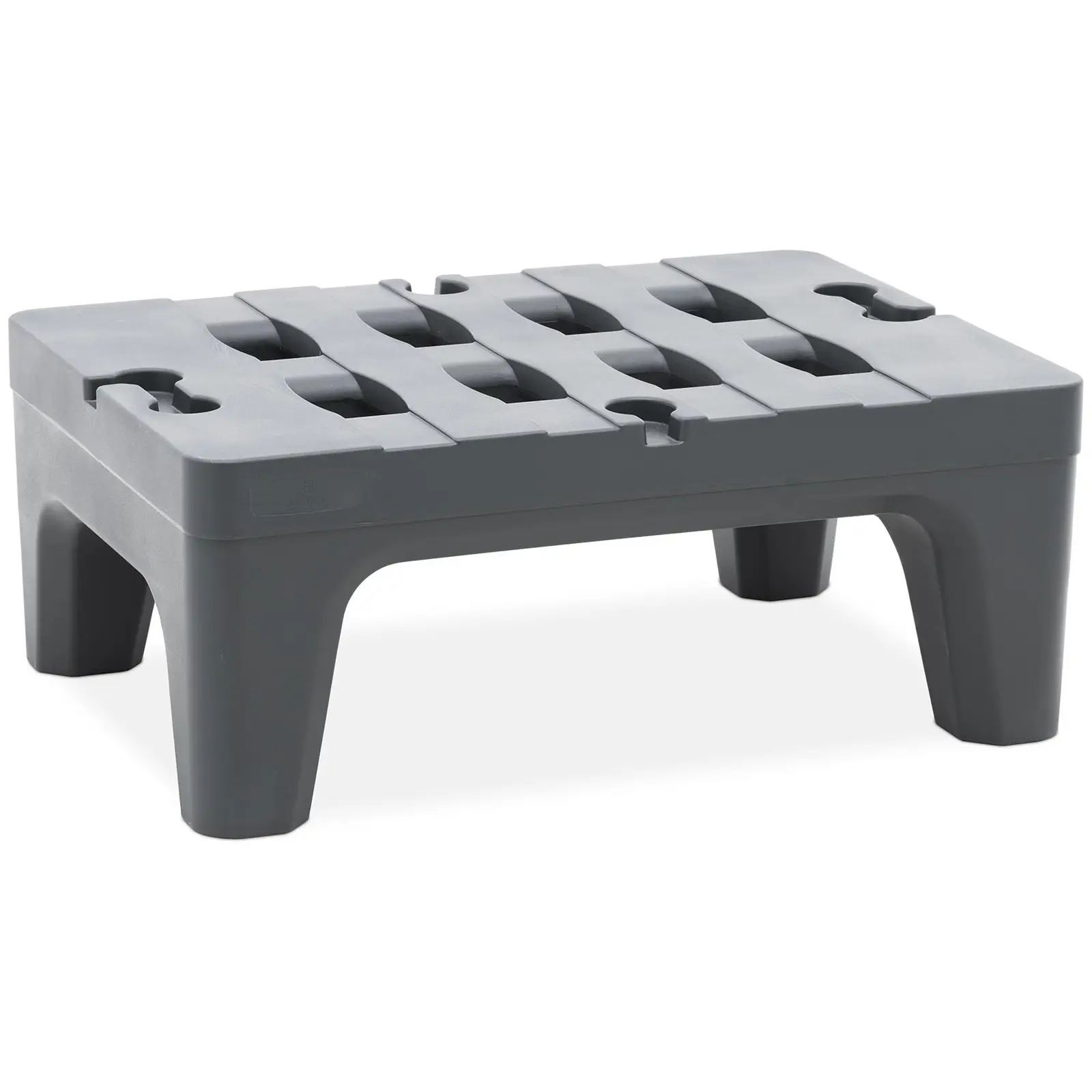 Hygieeninen, tuuletettu ja suojattu vesivahingoilta: Royal Catering:n säilytysjalustalla luot turvallisen etäisyyden tavaroidesi ja lattian välille. Tukeva hylly kantaa jopa 600 kg ja on siksi ihanteellinen yrityksille, joilla on paljon varastoituja tavaroita – olipa kyseessä pakastettu, jäähdytetty tai kuivattu. Lattiahyllyn korkeus on 30 cm. Näin ilma pääsee kiertämään hyvin varastoitujen tavaroiden alla. Lisäksi suojaat elintarvikkeita, laitteita ja vastaavia vaurioilta, jos nestettä vuotaa varastosta. Jalkojen ansiosta voit helposti puhdistaa varastoitujen tavaroiden alta. Hylly voidaan liittää mihin tahansa muuhun saman mallin säilytysalustaan. Työnnä tätä varten liitoskappale molemmissa laakeripohjassa oleviin valmiisiin syvennyksiin. Tämä antaa sinulle suuremman ja huojumattoman pinnan. Hyllyltä löytyy useita paikkoja, joiden avulla voit linkittää alustat haluamallasi tavalla ja jakaa säilytystilan optimaalisesti. Muovinen laakeripohja on kestävä, ruosteenkestävä ja taipumaton ja murtumaton. Kestävä materiaali voidaan puhdistaa nopeasti ja helposti.