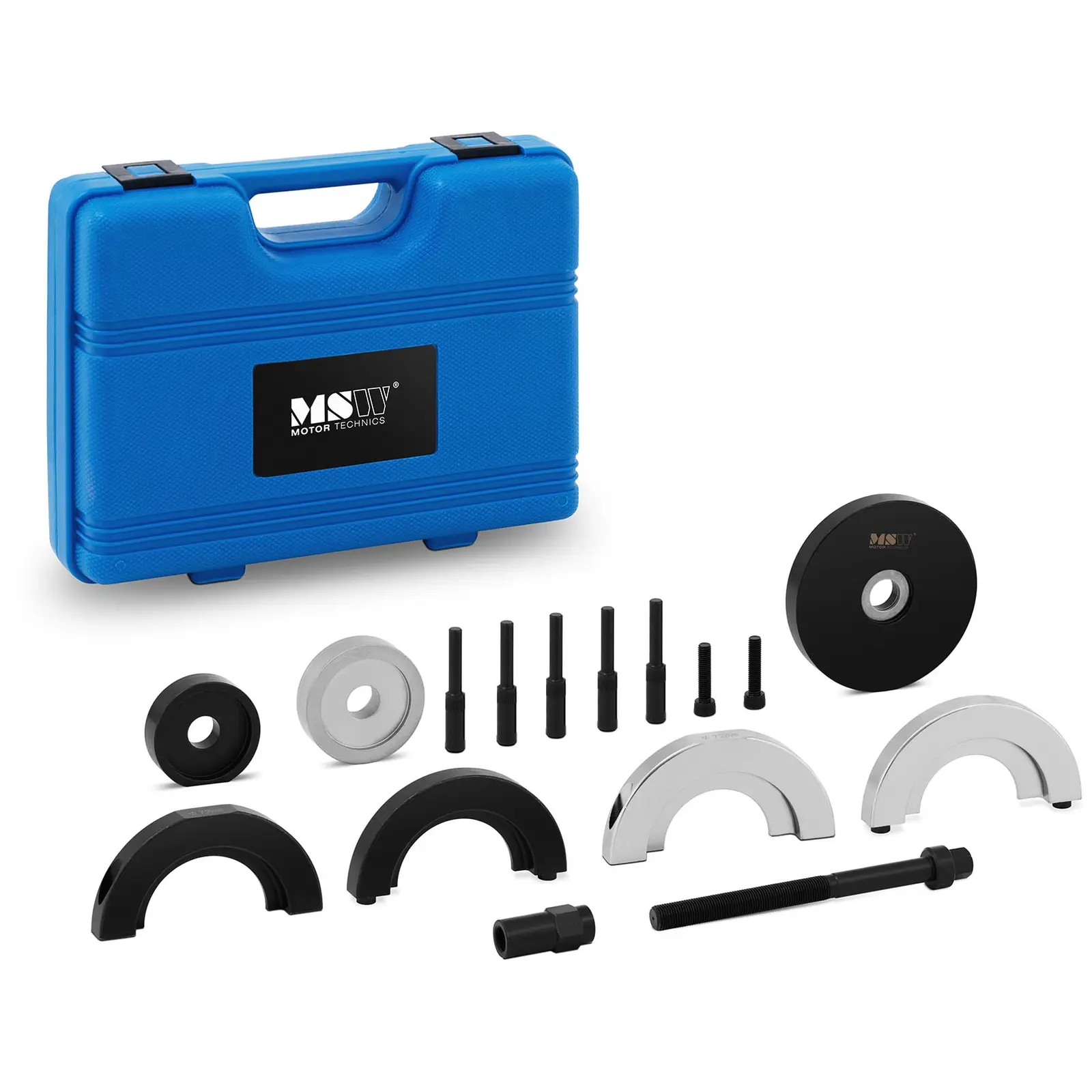 Viallisista pyöränlaakereista kuuluu kovaa rahisevaa ääntä, mikä on merkki siitä, että ne on vaihdettava uusiin. Tämän työn nopeuttamiseksi ja tehostamiseksi MSW on kehittänyt laakerityökalusarjan. Tämä ammattitason autotyökalusarja sopii erikokoisille pyöränlaakereille ja -navoille eikä saisi puuttua mistään korjaamosta. Nämä työkalut ovat optimaalinen valinta sujuvaan ja asianmukaiseen pyöränlaakerien irrotukseen ja uusien laakerien asennukseen. Sarjaan kuuluu erikokoisia painintyökaluja, joiden avulla voit tehokkaasti vaihtaa pyörien laakereita (esim. malleihin Audi A2, Seat Obota, Skoda Fabia, VW Fox tai Polo). Näin säästät sekä aikaa että rahaa. Pyöränlaakerin- ja navan vaihto onnistuu suoraan ajoneuvon luona. Joustintukia ei välttämättä tarvitsee purkaa, jolloin voit suuremmitta valmisteluitta puristaa pyöränlaakerin ulos sopivilla holkeilla. Voit sitten asennuskohdan puhdistettuasi painaa uuden pyöränlaakerin paikalleen vanhan avulla. Työtä helpottaa huomattavasti kaikkien sarjan työkalujen osien laadukas viimeistely. Laakerityökalu renkaille on suunniteltu päivittäiseen ammattikäyttöön. Se on erittäin kestävää terästä, jossa on pitkäikäinen ruostumista estävä pinnoite. Kuljetussalkussa kaikki sarjan osat säilyvät aina käden ulottuvilla hyvässä järjestyksessä.