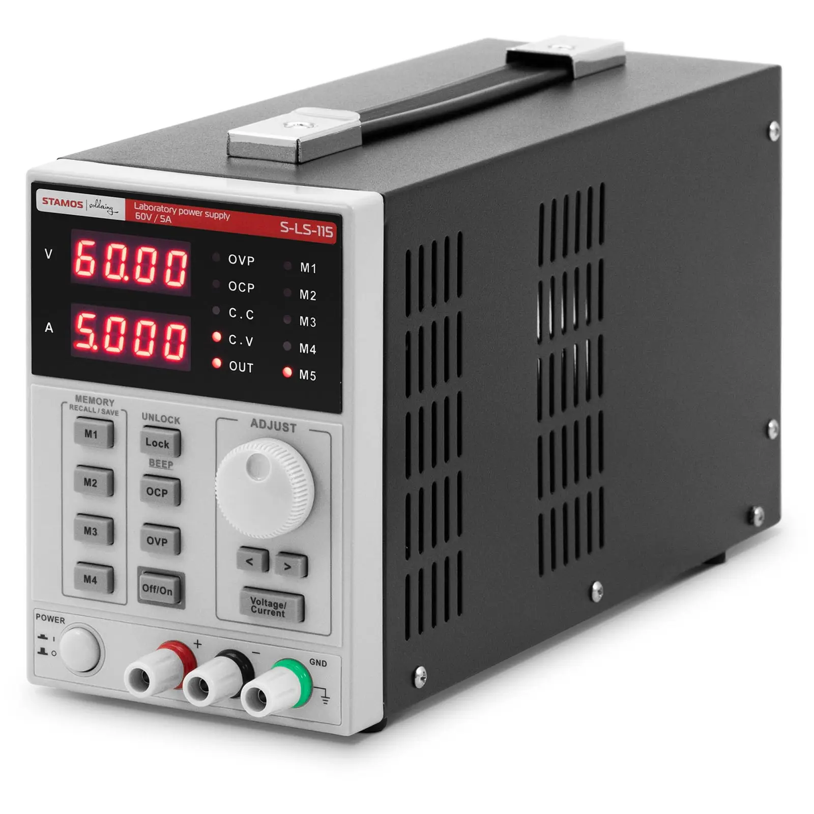 Laboratoriovirtalähteellä S-LS-115 voit syöttää tasavirtaa ulkoisille laitteille. Sen sähkövirran vahvuus ja jännite ovat yksilöllisesti säädettävissä kahdella erillisellä kanavalla. Viiden muistipaikan ansiosta voit käyttää laitetta erityisen tehokkaasti. Voit käyttää tätä virtalaitetta erityisesti teollisuuden, laboratorioiden, tietoliikenteen ja korjaamojen ammattimaisiin tarpeisiin sekä kaikkialla siellä, missä käytät sähkölaitteita. Näet aina helposti lähtöjännitteen ja virran suuruuden kookkaasta LED-näytöstä. Näytön numerot ovat aina selkeästi luettavissa huonossakin valaistuksessa. Tarvitseeko sinun asettaa virtalähteeseen usein samat arvot? Käytä sitten tämän laitteen viittä muistipaikkaa, jotka säästävät sekä aikaa että vaivaa. Tämä säädettävä virtalähde on kiertosäätimien ja painikkeidensa ansiosta erityisen helppokäyttöinen. Säätimet mahdollistavat 60 V DC lähtöjännitteen ja 5 A lähtövirran tarkan asettamisen. Asetuksen aikana voit tarkistaa vastaavat arvot suuresta LED-näytöstä. Lisäksi virtalähteessä on lukitustoiminto, joka estää valittujen asetusten muuttamisen vahingossa. Jos virtalähdettä käytetään tasavirtalähteenä (CV), se kytkeytyy automaattisesti jatkuvan virran tilaan (CA), kun asetettu kuormitusraja on saavutettu. Tämä estää kytkettyjen laitteiden vaurioitumisen. Tämä laboratorioteholähde täyttää tiukimmat turvallisuusstandardit: Laitteessa on ylikuormitussuojaus (OVP), ylivirtasuojaus (OCP), ja erityinen ylikuumenemissuoja (OTP). Integroitu tuuletin tarkkailee laitteen lämpötilaa ja mukauttaa nopeutensa sopivan jäähdytyksen aikaansaamiseksi. Nämä turvallisuusjärjestelmät takaavat virtalähteen turvallisuuden intensiivisessä ja jatkuvassakin käytössä. Lisäksi laitteessa on turvallisuuspuutteista ilmoittava summerihälytin, jonka voit säätää laboratorioisi vaatimuksia vastaavaksi. Voit kalibroida laitteen ohjelmiston avulla.