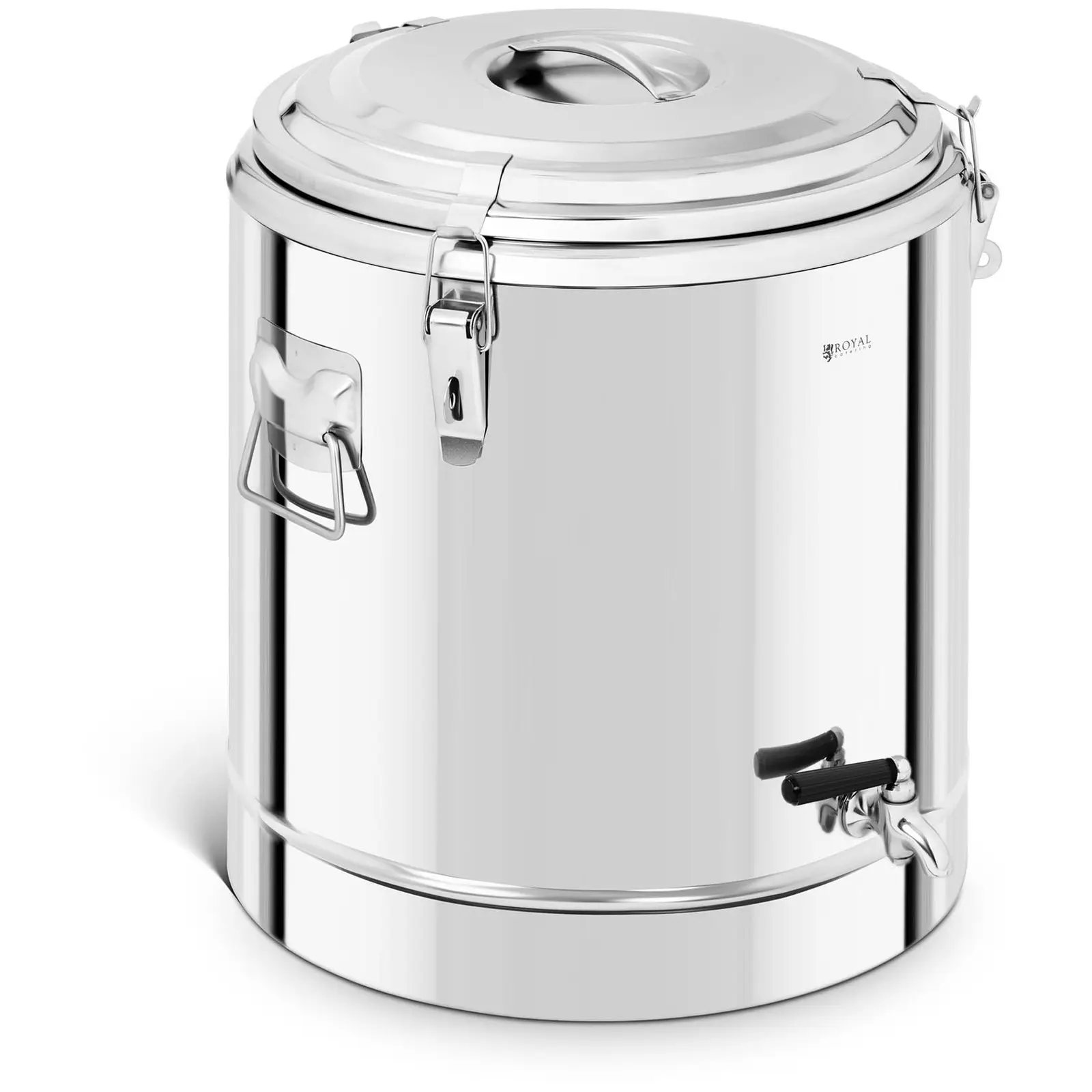 Ruostumatonta terästä oleva lämpöastia suunniteltiin kuumien ruokien sekä juomien turvalliseen ja ongelmattomaan kuljetukseen. Royal Catering – ravintolalaitteiden Online-kauppiaasi – kehitti tämän termoskattilan erityisesti ravintola-alanyrityksille käytettäväksi ravintoloissa ja hotelleissa, mutta myös suurkeittiöissä, kanttiineissa, sekä pitopalvelutapahtumissa. Kun arvostat keittiölaitteiden toiminnallisuutta, kestävyyttä ja asianmukaista muotoilua on tämä 30 litran tilavuinen ja tuplaseinällä eristetty lämpöastia annosteluhanalla korvaamaton apu lämpimänä pitoon. Hanallisen lämpöastian tilavuus on 30 litraa. Sekä astia että sen pohja on kuumuudenkestävää, tuplaseinäistä ruostumatonta terästä. Kahden ruostumaton terässeinän välissä on lisäksi lämpöä eristävä kerros. Tuplaseinäinen eristys mahdollistaa ruokien ja juomien lämpimänä pysymisen jopa kahdentoista tunnin ajan. Kuljetusastia on varustettu irrotettavalla ruostumaton teräskannella, joka varmistaa lämpötilan ylläpidon astiassa. Kansi on varustettu kahdella, helposti avattavalla salvalla, jotka pitävät kannen tiiviisti kiinni ja takaavat puhtauden. Lisäksi astiassa on kaksi ergonomista kahvaa, jotta helpottavat kuljetusta entisestään. Termoskattila on varustettu hanalla annostelun helpottamiseksi. Näin ollen tarjoilet juomat ja ruuat siististi ja roiskeitta. Annosteluhanan avulla tarjoilet asiakkaillesi nopeasti ja luotettavasti glögiä, teetä, kahvia ja keittoja sairaaloissa, kouluissa, päiväkodeissa tai jopa häissä. Termoskattila on erittäin hygieeninen ensiluokkaisella valmistuksellaan harjatusta ruostumattomasta teräksestä. Astian pinta on likaahylkivä, ei ruostu, kulu, eikä siihen tartu vesitahroja eikä ruuanjämiä. Ruuat säilyttävät alkuperäisen makunsa ja hajunsa. Lisäksi laadukas valmistus yksinkertaistaa lämpöastian puhdistusta ja huoltoa.