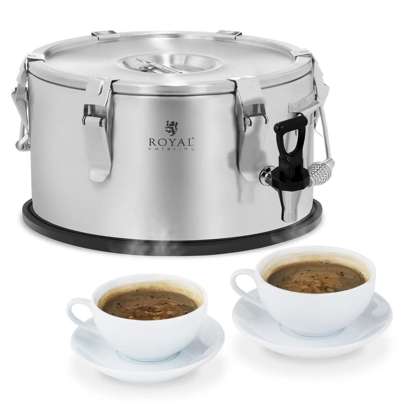 Lämpöastia RCTP-10DT on suunniteltu kuumien ja kylmien ruokien ja juomien turvalliseen ja helppoon kuljettamiseen. Royal Cateringin suunnittelema lämpöastia on tarkoitettu erityisesti sekä korkealaatuisille ravintola-alan yrityksille, kuten ravintoloille ja hotelleille että suurkeittiöille tai ruoan kotiinkuljetuspalveluille. Kun arvostat keittiötarvikkeidesi toiminnallisuutta, kestävyyttä ja käytännöllisyyttä, on tämä 10 litran tuplaseinällä eristetty lämpöastia korvaamaton apu keittiössäsi. Lämpöastia tyhjennyshanalla on tilavuudeltaan 10 litraa. Astia ja sen pohja on valmistettu lämmönkestävästä, tuplaseinäisestä ruostumattomasta teräksestä. Kahden ruostumattoman terässeinän välissä on 1,5 cm paksu lämmöneristyskerros. Tuplaseinä pitää ruuan ja juoman lämpötilan vakaana jopa kuudesta kahdeksaan tuntia. Myös ruostumaton teräskansi on eristetty tuplaseinällä, mikä lisäksi takaa lämpötilan pysymisen vakaana. Kansi on varustettu kuudella helposti avattavalla ja suljettavalla kiinnikkeellä. Kannen kulumaton ja pitkäikäinen silikonitiivisterengas pitää termoastian ilmatiivinä kuljetuksen ajan. Kansi on varustettu tuuletusventtiilillä, josta kuumien ruokien kuljetuksessa aiheutunut höyrynpaine voidaan tasata ennen kannen avaamista. Jotta tuuletusventtiilin käyttö on turvallista, voidaan se avata vain erityisesti muotoillulla kahvalla. Säiliön suu on suuri, jotta säiliön käyttö ja puhdistus olisi mahdollisimman vaivatonta. Jotta annostelu olisi mahdollisimman kätevää ja helppoa, on lämpöastia varustettu tyhjennyshanalla. Tämän vuoksi on ruokien ja juomien annostelu helppoa ilman roiskeita. Sairaaloissa, kouluissa ja päiväkodeissa tai jopa hääjuhlissa voit tyhjennyshanan avulla tarjota asiakkaille nopeasti ja luotettavasti teetä, kahvia tai keittoja. Lämpöastiassa on kaksi ergonomista kahvaa, jotka helpottavat kuljetusta. Astian pohjassa on joustava muovirengas, joka takaa astian tukevuuden ja paikallaan pysymisen myös liukkailla pinnoilla ja lisäksi suojaa astiaa vaurioilta. Se mahdollistaa myös useamman astian päällekkäin pinoamisen kannen ja muovirenkaan sopiessa täydellisesti sisäkkäin. Ensiluokkainen valmistus harjatusta ruostumattomasta teräksestä tekee lämpöastiasta myös erittäin hygieenisen. Astian pinta hylkii ruostetta, vesipisaroita, korroosiotekijöitä ja ruuantähteitä. Ruuat säilyttävät makunsa ja hajunsa alkuperäisenä. Hyvälaatuisen valmistuksen ansiosta lämpöastia säilyy pitkään hyvässä kunnossa ja on helppo puhdistaa.