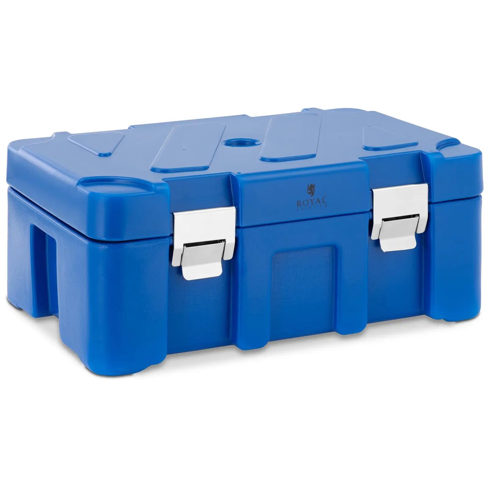 Royal Cateringin lämpölaukku takaa lämpimän ja kylmän ruoan turvallisen ja kätevän kuljetuksen. 610 x 405 x 260 mm lämpölaatikko on suunniteltu erityisesti tasokkaaseen ravitsemistoimintaan, kuten ravintoloille ja hotelleille, sekä kaupallisille keittiöille, ruokaloille tai ateriapalveluille. Ylhäältä täytettävän lämpölaatikon tilavuus on 22 l. 15 – 42 mm paksun eristeen ansiosta ruoan ja juomien lämpötila muuttuu vain noin 1 – 2 °C/h. Kansi suljetaan kiristyssalvoilla, jotka takaavat puhtaan kuljetuksen. Lisäksi säiliössä on järkevä itseilmastointijärjestelmä, joka takaa kuljetettavan ruoan tasaisen laadun. Ensiluokkaisen valmistustavan ja sileiden pintojen ansiosta lämpölaatikko erottuu edukseen myös hygieenisillä ominaisuuksillaan. Suuren materiaalitiheyden ansiosta laatikon pinta ei likaannu ja ruoka pysyy maultaan ja hajultaan muuttumattomana. Laadukas valmistustapa mahdollistaa myös termolaatikon helpon huollon ja puhdistuksen.