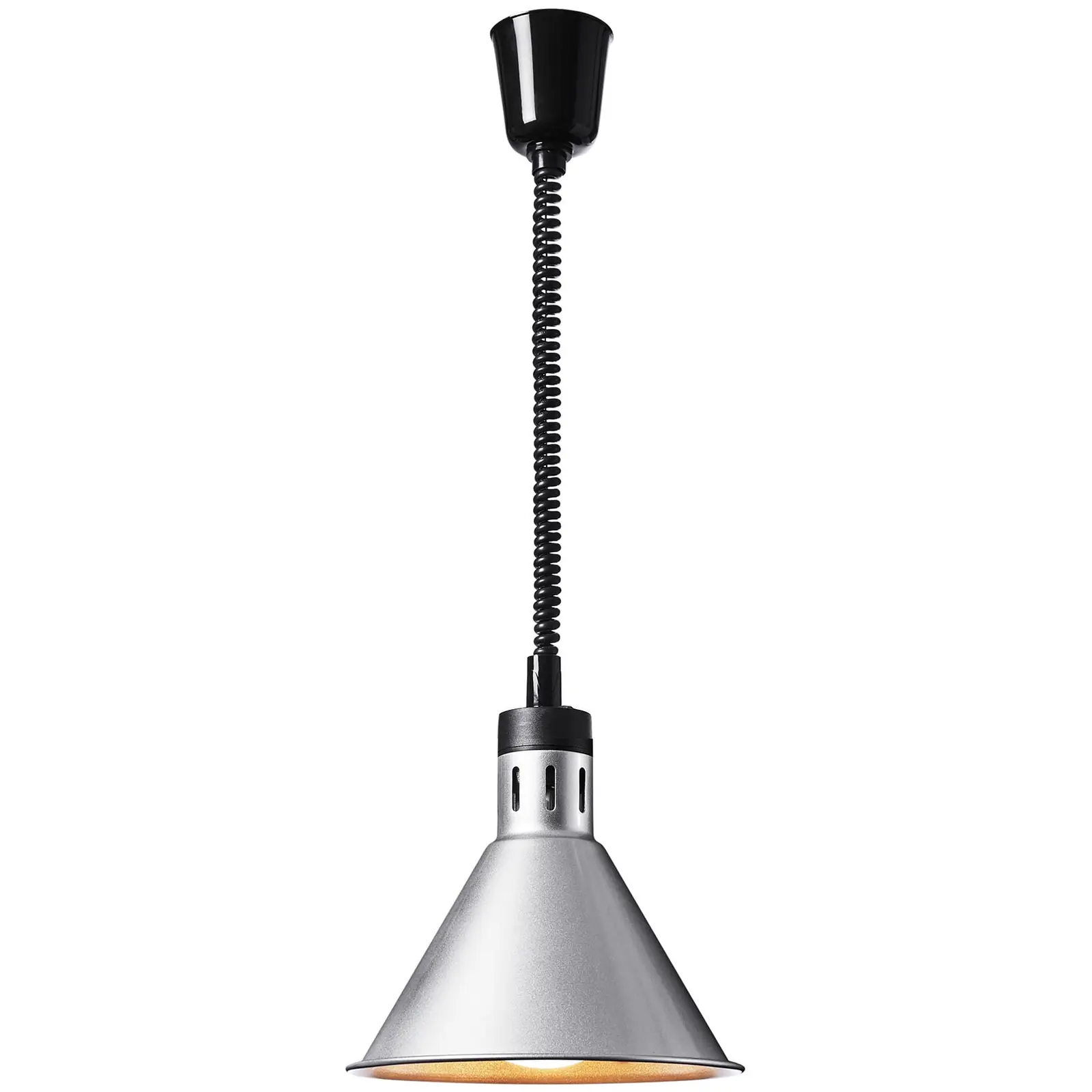 Royal Cateringin lämpösäteilijän RC-SHSFL09 avulla voit luotettavasti pitää kaikenlaisen ruoan lämpimänä ja samalla koristaa buffettiasi tyylikkäästi. Jalon muotoilunsa ansiosta lämpölamppu soveltuu erityisesti ravintola-alan asiakastiloihin. Olipa kyseessä ruokalan seisovapöytä tai juhlat, kuten häät tai yritysjuhlat – kompakti, hopeinen lämpövalaisin asettaa ruokasi ammattimaisesti tarjolle. Lämpösäteilijässä on pistotulppa E27 (max. 250 W) hehkulampuille. Tehokas lämpölamppu pitää ruoan ja ateriat lämpiminä tuntikausia. Näin säästyt ruokien uudelleenlämmitykseltä ja vieraasi voivat nauttia vasta valmistetusta mausta pidemmänkin lämpimänäpidon jälkeen. Huomio: lämmitystehoon vaikuttaa lämpölampun ja lämmitettävän ruoan välinen etäisyys. Näin voit yksilöllisesti säätää halutun lämpötilan eri ruuille. Johdon pituus on helposti säädettävissä 40 – 170 mm välille lampun ripustamisen jälkeen. Royal Catering luottaa lämpösäteilijöidensä ajattomaan ja eleganttiin muotoiluun ja mahdollistaa täten ruoan houkuttelevan esillepanon. Toiminnallisuuden ja elegantin muotoilun yhdistelmä tekee lämpölampusta välttämättömän jokaisen buffettiin ja kaikkialle, missä monta ruokalajia on tarjoiltava lyhyessä ajassa. Kompaktien mittojensa ansiosta lämpösäteilijä soveltuu erityisen hyvin liikkuvaan käyttöön esimerkiksi häissä, suurissa tapahtumissa, messuilla ja iltajuhlissa. Kotelo on valmistettu kestävästä ja naarmuuntumattomasta teräksestä, joka takaa lampulle pitkän käyttöiän ja tekee siitä on helposti kuljetettavan. Materiaali on korroosionkestävä ja sopii täydellisesti ravintola-alan hygieniavaatimuksiin. Lämpölamppu toimii 230 V:n liitännällä.