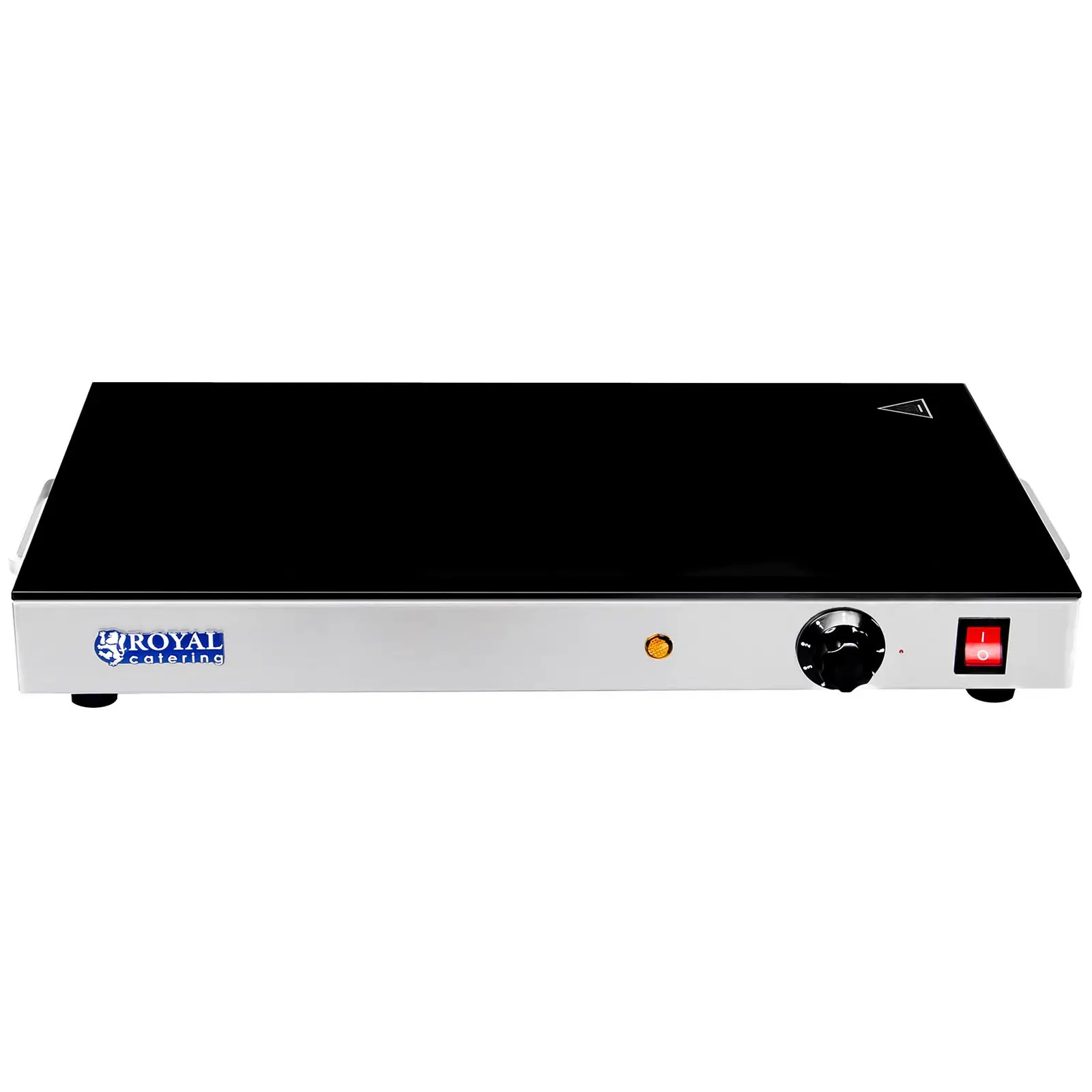 Royal Cateringin RCHP-500G-lämpölevy suunniteltiin pitämään ruoka-annokset pitkään lämpiminä. Laite pitää ruoat tarjoiluun saakka lämpiminä, jos tarjoilet ruokalajeja eripituisilla valmistusajoilla. Lämpölevy sopii myös erinomaisesti brunssin tai buffetin tarjoilua varten ja takaa sen, että tarjoilemasi ruoka on aina täydellisen lämmintä. Tukevan ja tilaa säästävän laitteen tason mitat ovat 53,0 x 32,5 cm, joten se tarjoaa tarpeeksi tilaa myös suurille tarjoilulautasille. Laite on valmistettu ruostumattomasta teräksestä ja sen taso karkaistusta lasista. Lämpölevyssä on neljä liukumatonta kumijalkaa, joiden ansiosta laite pysyy tukevasti paikoillaan. Laitteessa on lämpövastus, joka lämmittää koko levyn tasaisesti. Laitteen lämpötila on säädettävissä etupuolen nupeilla 30 – 85 °C välillä. Valmiustilan valo ilmoittaa, kun laite on valmis käytettäväksi.