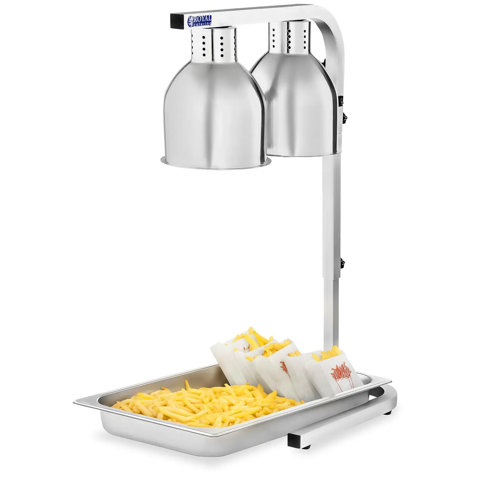 Valmistamasi ruoka tulisi tietenkin tarjoilla lämpötilassa, jossa se pääsee parhaiten oikeuksiinsa. Royal Cateringin lämpösäteilijä RCWB-550I on täydellinen apuväline juuri valmistettujen ruokien kuten ranskanperunoiden, pihvien tai vaikkapa lettujen pitämiseen lämpiminä. Tämä lämmitin on erittäin monipuolinen ja sopii sekä ravintolan keittiöön että tarjoilupuolelle. Lämmittimen miellyttävä valo kiinnittää asiakkaidesi huomion. Lämpösäteilijä lämmittää ruokasi infrapunasäteilyn avulla. Infrapunasäteet lämmittävät pinnan, jolle ne osuvat ja pitävät sen lämpimänä. Lämpösäteilijän toimituskokonaisuuteen kuuluu kaksi valkoista 275 W:n infrapunalamppua, jotka on asennettu lampunvarjostimiin. Toisin kuin tavanomaisissa lämpösäteilijöissä ruoka ei lämpene vain pinnalta vaan kauttaaltaan, sillä infrapunasäteet tunkeutuvat elintarvikkeisiin ja lämmittävät ne tasaisesti. Vapaasti sijoitettavan lämpösäteilijän jalka toimii samalla mukana toimitetun 1/1 GN-elintarvikeastian pidikkeenä. Sen mitat ovat 50 x 30 x 6,5 cm ja tilavuus 7,4 litraa. Se on irrotettavissa ja materiaalina käytetyn ruostumattoman teräksen ansiosta vankka, soveltuva elintarvikekäyttöön ja konepesunkestävä. Lampun varren korkeuden voi säätää helposti ja nopeasti välille 600 ja 796 mm. Korkeutta muuttamalla voit säätää myös lämpötilaa alueella 40 – 70 °C. Näin sinulla on kaksi eri käyttömahdollisuutta. Voit itse valita, haluatko säilyttää valmistamasi ruoan lämpimänä vai kuumentaa sen. Lampunvarjostimien reiät viilentävät lamppuja ja pidentävät niiden käyttöikää. Kaikki lämpösäteilijän osat on valmistettu kiillotetusta alumiinista. Tämä rakenne ei ole vain erityisen kevyt ja tukeva mutta myös yksinkertainen ja nopea puhdistaa. Koska laite on kevyt, vain 2,6 kg, sen voi kuljettaa kätevästi halutulle käyttöpaikalle. Viisi kumijalkaa suojaavat lämpösäteilijän alla olevaa tasoa naarmuilta ja muilta vaurioilta.