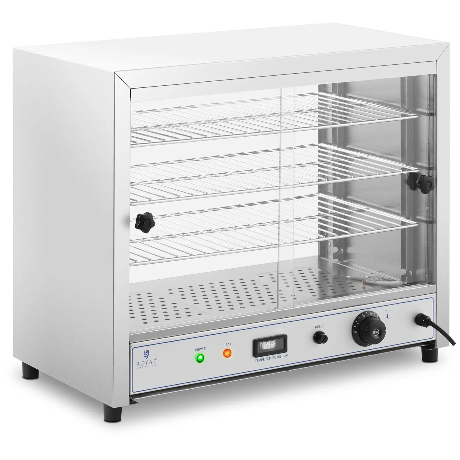 Royal Cateringin ravintolalaitteisiin kuuluva lämpövitriini on ihanteellinen lämpimänä pitämiseen ja erilaisten aterioiden ja ruokien esillepanoon. Lämpövitriini tarjoaa vieraillesi aina tuoretta ja valmista ruokaa hotellin, kahvilan tai ravintolan buffetissa. Lämpövitriinin sisällä on 3 säilytystasoa, joille voit asetella ruoat. Hyllyt, joiden välinen etäisyys on 9 cm, asetetaan sivuilla oleviin, kotelon sisätilaan integroiduille kiskoille. Tarvittaessa alahyllyn etäisyyden voi siirtää alempaan kiskoon, jolloin vitriiniin mahtuu ruokaa myös korkeammissa astioissa. Jokainen hylly tarjoaa runsaasti tilaa 56,6 x 30 cm mitoillaan. Lämpövitriinin sisätilat voidaan lämmittää 30 – 85 °C lämpötilaan nopealla ja tehokkaalla 1 000 watin lämpöelementillä. Tarkka termostaatti ylläpitää kätevältä ohjauspaneelilta säädettävissä olevaa lämpötilaa luotettavasti. Lämpövitriinin suorakulmainen muoto tarjoaa enemmän tilaa ruuille kuin monet viistomaiset mallit. Kotelo on valmistettu tukevasta ruostumattomasta teräksestä, etu- ja takaosa on varustettu karkaistulla lasilla. Edessä on kaksi tilaa säästävää lasista liukuovea ruoan ottamiseksi tai täyttämiseksi. Lämpövitriinin puhdistus on erittäin helppoa. Kotelon alareunassa on keräyslaatikko ruokajämille. Tämä on helppo irrottaa ulkopuolelta säännöllistä puhdistusta varten. Tasaisten lasipintojen ja ruostumatonta terästä olevien kotelon ja lisäosien ansiosta erityisten puhdistusaineiden käyttö ei ole tarpeellista.