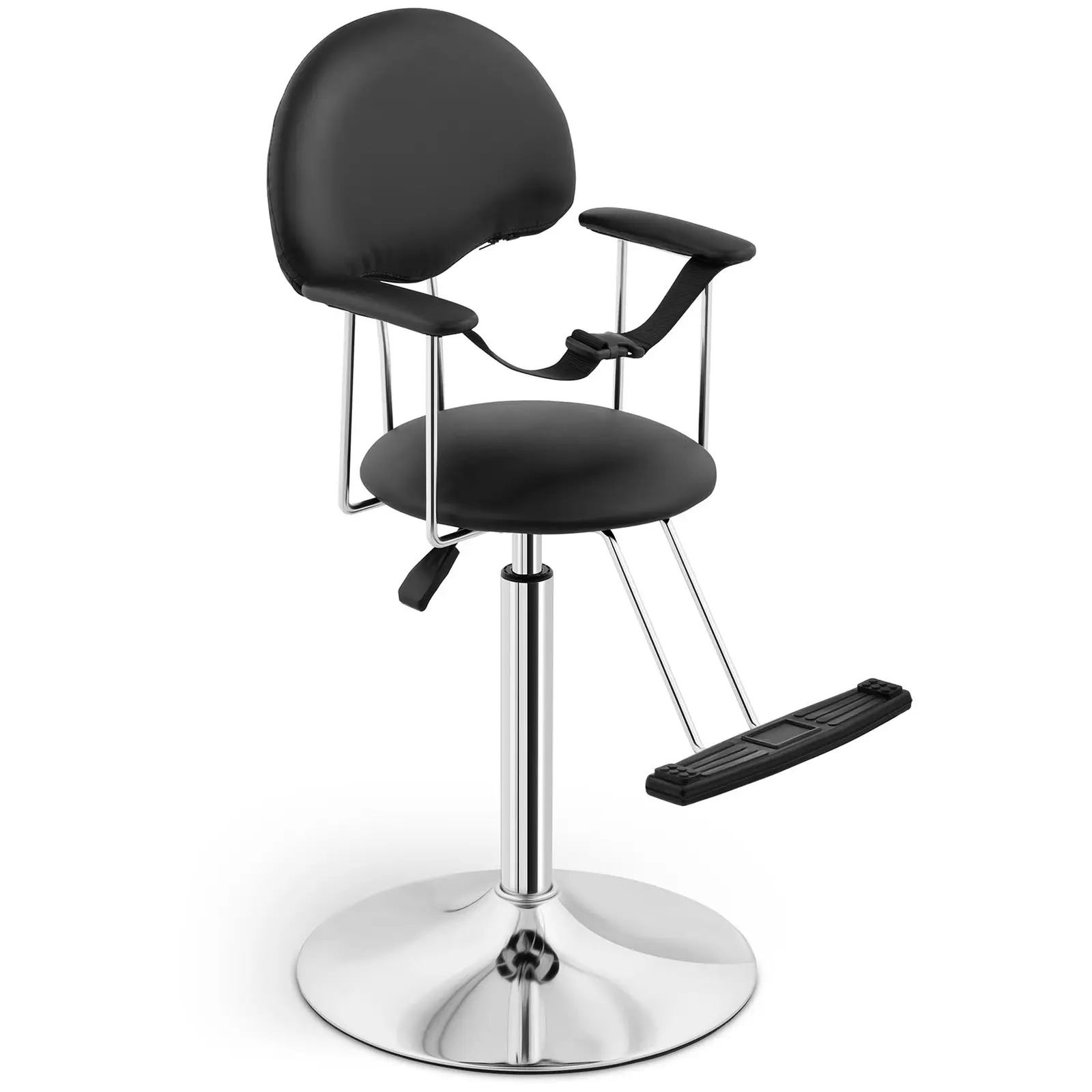 Physan klassinen parturituoli PHYSA BIRMINGHAM BLACK on loistava täydennys kampaamosi sisustukseen. Se on pienen ominaispainonsa ja kompaktien mittojensa ansiosta kannettava. Näin ollen sen käyttö on erittäin joustavaa ja se on samanaikaisesti sekä mukava että kestävä. Täten se on ihanteellinen ammattimaiseen käyttöön kampaamoissa, kauneushoitoloissa jne. Se sopii siis kaikkialle, missä työssäsi tärkeänä osana on korkeudesta säädettävä ja käännettävä tuoli. Lasten parturituolin maksimi kuormitus on 100 kg ja siinä on lujatekoinen hydrauliikkapumppu istumakorkeuden ja -asentojen säätöä varten. Lisäksi parturituoli on erityisen pitkäikäinen. Kromitettu jalka on 44,5 cm leveä ja on täten erittäin vankka perusta, jolla tuoli pysyy varmasti paikallaan. Pienet asiakkaasi kokevat parhaan mahdollisen mukavuuden erittäin miellyttävällä, ergonomisesti muotoiltulla istuimella, joka on täytetty vaahtomuovilla. Keinonahka päällyste ja erittäin tarkat saumat antavat parturituolille klassisen tyylikkään ulkonäön, jota pehmustetut, ruostumattomasta teräksestä valmistetut käsinojat korostavat. Lisäksi tuolissa on kätevä jalkatuki ja turvavyö. Rakenne sekä ergonominen ja selkää säästävä tuolin muoto sopivat täydellisesti täyttämään lasten tarpeet. Kaikki lapset tulevat rakastamaan tätä parturituolia! Lisä mukavuuden tuo tuolin 360° kääntyvyys: Voit asettaa tuolin mihin asentoon vaan, jotta vaativankin kampauksen teko on mahdollista. Lisäksi yksinkertainen ja nopea korkeudensäätö on mahdollista tuolin tehokkaalla hydrauliikkapumpulla. Sillä voit säätää istuinkorkeuden 56,5 – 81 cm välillä. Hyvälaatuinen materiaali ja kiinteä rakenne tekevät tuolista erittäin luotettavan työvälineen. PVC-nahkapäällyste tekee tuolista helposti puhdistettavan ja huollettavan, koska se hylkii kosteutta ja pölyä.
