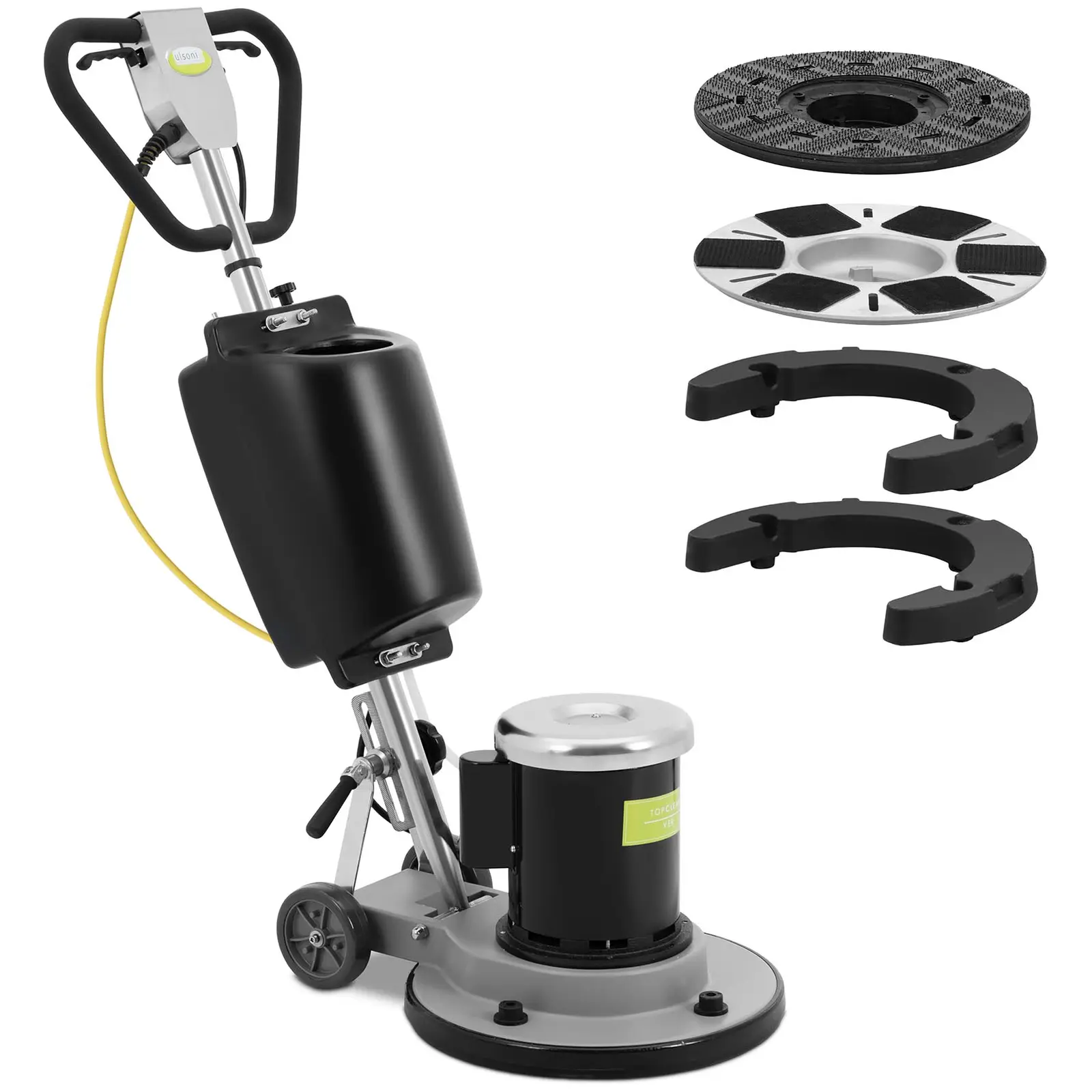 Kasvata asiakkaidesi luottamusta puhtailla lattioilla, olipa kyse hotelleista, supermarketeista tai toimistorakennuksista, joissa on paljon liikennettä. Ulsonix-yksilevykoneella voit puhdistaa nopeasti ja tehokkaasti monenlaisia lattiapäällysteitä, kuten laattoja, PVC:tä, marmoria, puuta tai linoleumia. Tarvittaessa voit käyttää konetta myös kiillotukseen, jotta pinnat kiiltävät. Säädä kahvan korkeutta, kytke päälle ja pois päältä. Kiillotuskone on helppokäyttöinen ja käyttövalmis heti alkuasennuksen jälkeen. Kun olet täyttänyt puhdistussäiliön, säädä ensin ohjauskahvan kulmaa niin, että se napsahtaa sylissäsi ja lantiosi välissä. Korkeussäädettävän kahvan ansiosta konetta voivat helposti käyttää niin suuret kuin pienetkin ihmiset. Kun kahva on mukavalla työskentelykorkeudella, voit käynnistää tehokkaan 1864 W -moottorin napin painalluksella. Heti kun painat ergonomisen ohjauskahvan molempia vipuja, yksilevyinen kone liikkuu. Vapauta vipu ja kone pysähtyy – lattiapäällysteen puhdistaminen ei voisi olla helpompaa! Lattiankiillotuskone on niin kompakti, että voit ohjata sitä helposti ja määrätietoisesti ahtaissakin paikoissa. Raskaat rautalevyt painavat laitetta niin, että se liukuu turvallisesti ja rauhassa lattialla. Täyden 175 rpm:n ansiosta voit poistaa jopa pinttyneen lian yksilevykoneella. Voit kiinnittää tarvittavat puhdistustyynyt mukana toimitettuun levyyn hetkessä. Näin voit sovittaa laitteen joustavasti erilaisiin lattiapäällysteisiin. 13 m pitkän virtajohdon ansiosta voit liikkua vapaasti suurissa huoneissa tai pitkillä käytävillä. Varmista, että pidät kaapelia aina turvallisesti mukanasi ja vältä kompastumisvaaraa.