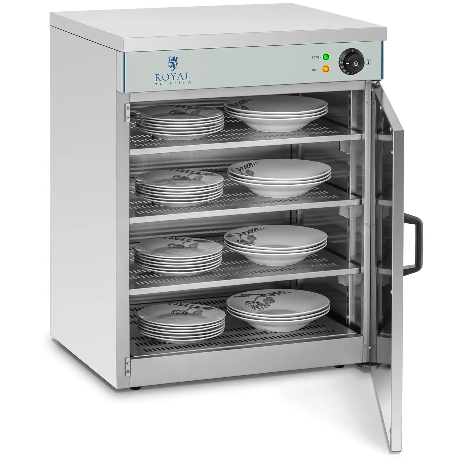 Royal Cateringin sähköllä toimivalla RCWS-60-lautaslämmittimellä lämmität astiasi nopeasti ja helposti. Esilämmitetyt astiat hidastavat ruokien ja juomien jäähtymistä, ja näin ollen takaavat ihanteellisen tarjoilulämpötilan. Ruokien lämpimänäpito ja jäähtymisen viivästäminen auttavat myös organisoimaan tarjoilun joustavasti kiireen keskellä. Ammattimainen laitteemme on sisältä ja ulkoa valmistettu ruostumattomasta teräksestä. Kupeille ja lautasille on lämmitystilaa kolmella eri tasolla. Hyllyjen korkeutta voidaan säätää. Sileiden pintojen ansiosta on RCWS-60-lautaslämmittimen puhdistaminen ja desinfioiminen helppoa ja nopeaa. Automaattisen lämpötilan vakauden tarkistuksen avulla voit säätää haluamasi toimintalämpötilan säätövälillä 30 – 110 °C.