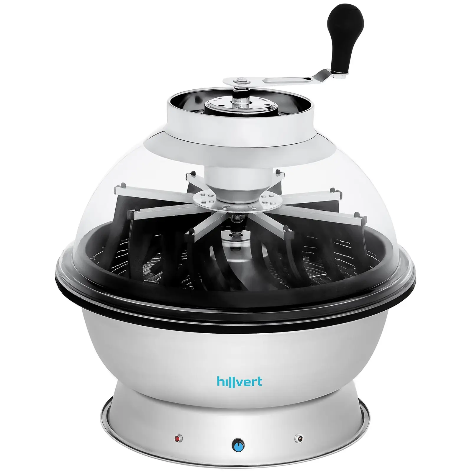 Hillvertin lehtimylly HOWSON-16TE tarjoaa sinulle huippuluokan käyttömukavuutta kasvien nopeaan ja vaivattomaan trimmaamiseen ja leikkaukseen. Kaikenlaisten kasvien lehtien ja kukintojen leikkaaminen irti ja oksien silppuaminen sujuu tällä laitteella kuin leikiten. Jos haluat esimerkiksi valmistaa eteerisiä tai aromaterapiaöljyjä, potpourria tai tuoksupusseja kotikäyttöön, tämä laite on sinulle juuri oikea apuväline. Lehtimyllyyn kuuluu kahden eri tyypin teriä laadukkaasta ruostumattomasta teräksestä. Voit valita laitteessa käytettävien terien tyypin leikattavan kasvin mukaisesti: joko kolme kaksipuolista suoraa terää tai viisi lankaterää. Leikkurin toimintaperiaate on nerokkaan yksinkertainen: kasvit asetetaan nuppuineen tai kukintoineen irrotettavan ritilän päälle. Käyttötarkoitukseen sopivat terät kiinnitetään ritilän alapuolelle. Laite suljetaan kuvullaan ja pyörimisliike erottaa lehdet ja nuput kasvista. Voit valita lehtimyllyn sähköisen tai manuaalisen käyttötavan välillä: joko pyörität sitä käsin kammella tai annat laitteen 20 W:n sähkömoottorin hoitaa työt. Tässä käyttötavassa lehtimyllyn nopeus on jopa 2 050 kierrosta minuutissa. Voit säätää pyörimisnopeutta portaattomasti kiertosäätimestä. Käsikäytössä sinun ei tarvitse tehdä mitään muuta kuin vain pyörittää laitteen kampea. Kampi irrotetaan kuvusta sähkökäyttöä varten. Laitteen kupu on läpinäkyvä, joten voit koko ajan pitää prosessia silmällä tietääksesi, koska haluamasi leikkaustulos on saavutettu. Kupu on kevyttä, helppohoitoista ja kestävää muovia. Laitteen yläosassa kuvun alla on kahdeksan vartta, joissa on elastiset jakajat. Ne työntävät lehdet ja nuput hellävaroen ritilän läpi ja sen alapuolella olevien ruostumattomien leikkuuterien yli. Kasvien osat leikataan irti niitä vaurioittamatta tai tuhoamatta. Ritilässä on kuminen tiivistereunus, joka osaltaan tekee halkaisijaltaan 43,5 cm (16 tuuman) astian ja kuvun vankemmaksi leikkauksen aikana. Lehtimylly on erittäin vankka, luja ja helppokäyttöinen. Se on kevyt ja yksinkertainen kuljettaa. Suosittelemme tätä leikkuria lämpimästi kotikäyttöön. Kaikki osat ovat irrotettavissa, helppoja puhdistaa ja kestävät konepesun.