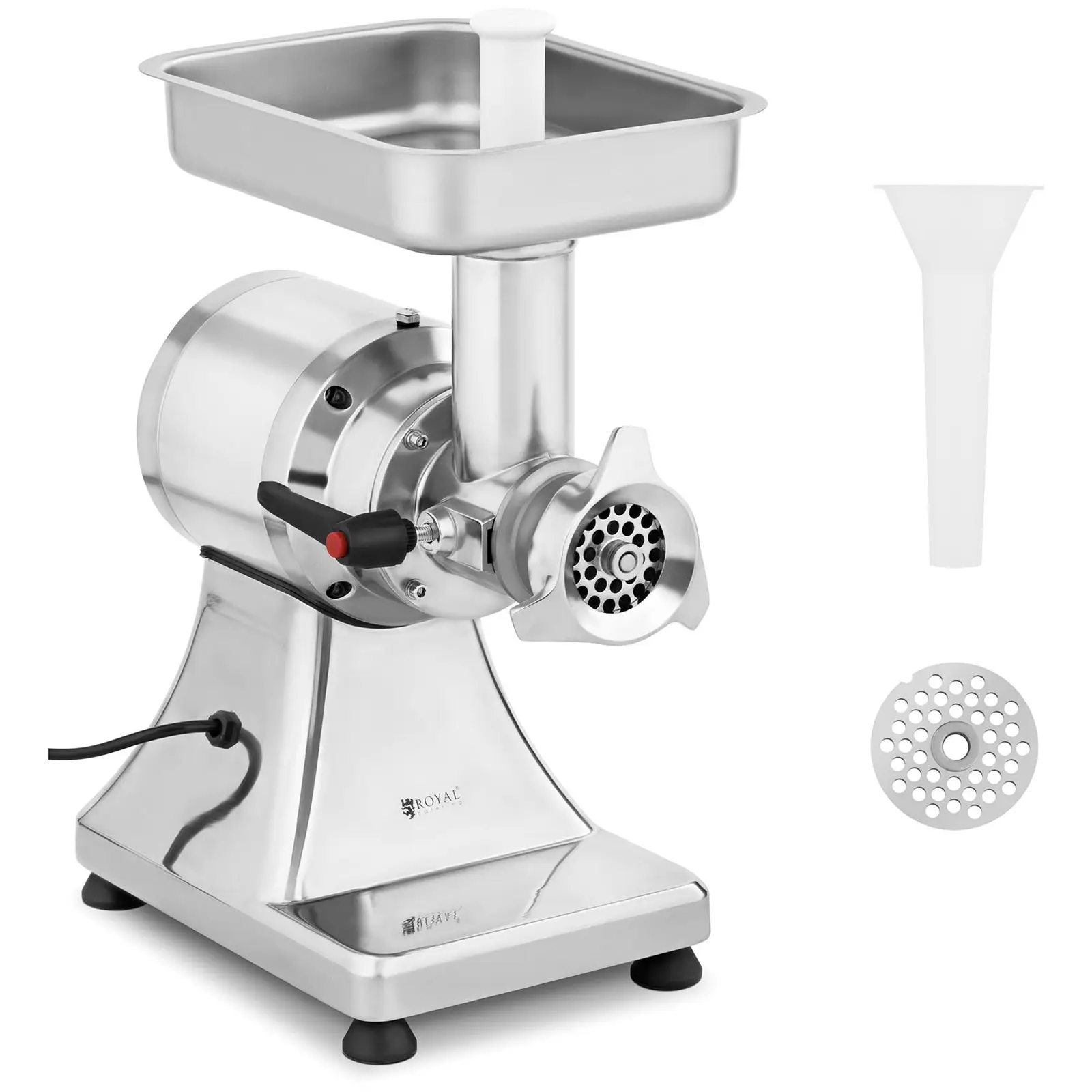 Royal Cateringin lihanjalostustuotteista löytyvä lihamylly RCFW 121PRO on tehokas ja helppokäyttöinen laite elintarvikkeiden käsittelyyn. Laadukkaiden osiensa ansiosta se soveltuu ammattikäyttöön ravintoloihin tai lihakaupoihin. Tehokas 550 watin moottori aikaansaa vaivattomasti suurien lihamäärien pilkkomiseen tarvittavan voiman. Kohtuullisella energiankulutuksella lihamylly voi käsitellä jopa 120 kg lihaa tunnissa. Laite toimii yksinkertaisesti ja tehokkaasti virtakytkimellä. Royal Cateringin ravintolalaitteiden lihamyllylle on ominaista pitkä käyttöikä ja erityisen laadukas valmistus. Kotelo on valmistettu alumiiniseoksesta ja ruostumattomasta teräksestä (SS420) valmistetut osat ovat huomattavasti vakaampia kuin vastaavat, muista materiaaleista valmistetut. Lisäksi käytetty materiaali osoittautuu erittäin hygieeniseksi ja sopii erinomaisesti elintarvikkeiden käsittelyyn. Lihamylly tarvikkeineen sopii monipuolisesti omien hampurilaisten, makkaroiden ja muiden lihatuotteiden valmistukseen. Suuri lihan säilytystaso ja muovinen survin helpottavat työtäsi. Voit työntää ruoan turvallisesti syöttöaukkoon. Halkaisijaltaan 6/8 mm reikälevyjen läpi saadaan hienoa ja karkeasti leikattua lihaa, jota voidaan jatkokäsitellä optimaalisesti. Lihamyllyn kumitassut eivät ainoastaan suojaa herkkiä pintoja ja luo tukevaa jalustaa, vaan myös vähentävät käytön aikana esiintyvää tärinää. Tämä takaa mukavan työskentelyn. Laite on suojattu sulakkeella oikosulun varalta.