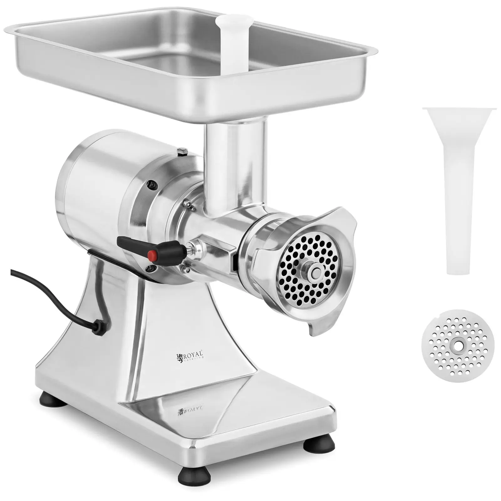 Royal Cateringin lihanjalostustuotteista löytyvä lihamylly RCFW 321PRO on tehokas ja helppokäyttöinen laite elintarvikkeiden käsittelyyn. Laadukkaiden osiensa ansiosta se soveltuu ammattikäyttöön ravintoloihin tai lihakaupoihin. Tehokas 900 watin moottori aikaansaa vaivattomasti suurien lihamäärien pilkkomiseen tarvittavan voiman. Kohtuullisella energiankulutuksella lihamylly voi käsitellä jopa 220 kg lihaa tunnissa. Laite toimii yksinkertaisesti ja tehokkaasti virtakytkimellä. Royal Cateringin ravintolalaitteiden lihamyllylle on ominaista pitkä käyttöikä ja erityisen laadukas valmistus. Kotelo on valmistettu alumiiniseoksesta ja ruostumattomasta teräksestä (SS420) valmistetut osat ovat huomattavasti vakaampia kuin vastaavat, muista materiaaleista valmistetut. Lisäksi käytetty materiaali osoittautuu erittäin hygieeniseksi ja sopii erinomaisesti elintarvikkeiden käsittelyyn. Lihamylly tarvikkeineen sopii monipuolisesti omien hampurilaisten, makkaroiden ja muiden lihatuotteiden valmistukseen. Suuri lihan säilytystaso ja muovinen survin helpottavat työtäsi. Voit työntää ruoan turvallisesti syöttöaukkoon. Halkaisijaltaan 6/8 mm reikälevyjen läpi saadaan hienoa ja karkeasti leikattua lihaa, jota voidaan jatkokäsitellä optimaalisesti. Lihamyllyn kumitassut eivät ainoastaan suojaa herkkiä pintoja ja luo tukevaa jalustaa, vaan myös vähentävät käytön aikana esiintyvää tärinää. Tämä takaa mukavan työskentelyn. Laite on suojattu sulakkeella oikosulun varalta.