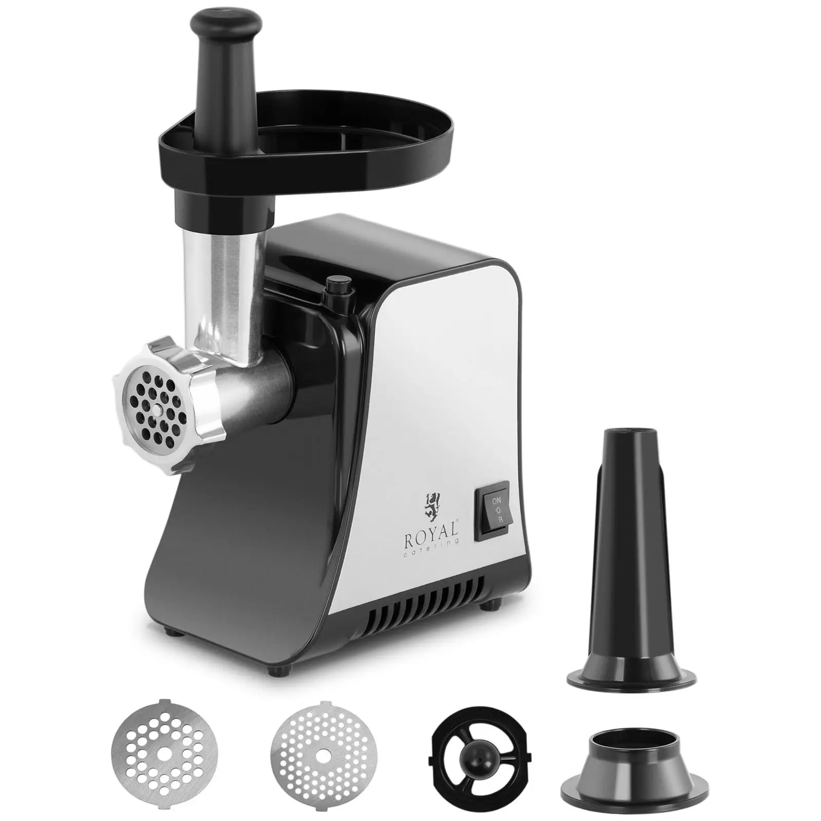 Royal Cateringin lihamylly RCMM- 1300W on käytännöllinen ja helppokäyttöinen laite elintarvikkeiden valmistamiseen. Se sopii niin kotikäyttöön kuin myös vaativampaan ammattikäyttöön kuten teurastamoihin tai ravintoloihin. Suorituskykyinen 1 300 W:n moottori takaa hienontamisen onnistumisen vaivatta. Lihamylly jauhaa 48 kg tunnissa käyttäen vain kohtuudella energiaa. Royal Cateringin sähkölihamyllylle on ominaista korkea kestävyys ja erityisen korkea laatu. Ruostumattomasta teräksestä sekä muovista valmistetut osat ovat huomattavasti vakaampia kuin vastaavissa malleissa. Lisävarusteet sopivat monipuoliseen käyttöön kuten hampurilaisten, makkaroiden tai muiden lihajalosteiden valmistamiseen. Lisäksi ne käyvät monien muiden elintarvikkeiden kuten tomaattien, nuudeleiden, chilin palkojen tai kuivattujen hedelmien jauhamiseen. Suuri säiliö lihalle ja muovinen työntölasta helpottavat työskentelemistä. Voit painaa elintarvikkeet turvallisesti yhteen. Mukana tulevien suutinten avulla on helppo valmistaa makkaroita. Liha liikkuu jokaisella kierroksella tehokkaasti työntökierukan myötä terien leikattavaksi puristuen lopulta reikälevyn läpi ulos. Halkaisijaltaan 3,5 tai 7 mm kokoisista tai kolmionmuotoisista rei´istä tulee ulos tasaisesti hienonnettua massaa, jota voi työstää erinomaisesti. Myllyssä on kaksisuuntainen moottori, jonka avulla saa juuttuneet elintarvikkeiden tähteet paremmin pois. Konetta ei täydy siis purkaa, jos se menee jumiin. Kumijalat eivät vain suojaa herkkiä pintoja ja tarjoa turvallisen pidon, vaan vähentävät myös käytön aikana tapahtuvaa tärinää. Tämä varmistaa mukavan työskentelyn.