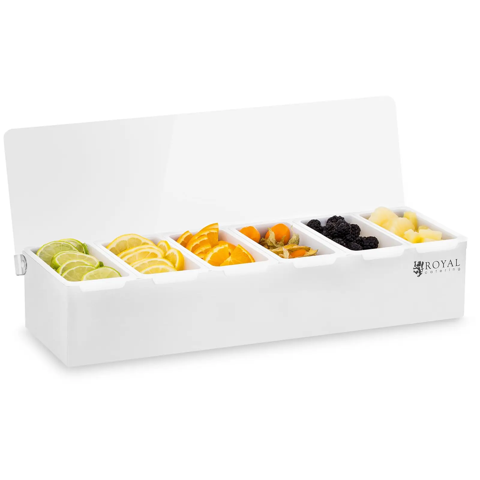 Ammattitason ruoanlaitossa kaikkien työvaiheiden on sujuttava saumattomasti. Royal Cateringin lokerikolla RCCBP 6 pidät kaiken täydellisessä järjestyksessä. Voit säilyttää erilaisia ruoka-aineita, kuten raakaraasteita tai hedelmiä kätevästi erillään toisistaan ruoan valmistukseen asti. Tämä lokerikko on moderni ratkaisu ammattikeittiöihin ravintoloissa, pikaruokaloissa, baareissa, festivaalikojuissa tai pitopalveluissa. Lokerikkoon kuuluu viisi erillistä muoviastiaa, jotka voit täyttää miten haluat ja säilyttää siinä. Astiakohtainen tilavuus on 450 ml ja niiden yhteenlaskettu tilavuus enintään 2,7 litraa elintarvikkeita. Etenkin kiireisessä keittiökäytössä lokerikko palvelee käytännöllisenä järjestyksen pitäjänä ruokien valmistuksessa. Lokerikon runko on korkealuokkaista ruostumatonta terästä, mikä takaa sen vankkuuden ja kestävyyden. Materiaalin kestävyys suojaa sitä sekä biologisilta että kemiallisilta reaktioilta, mikä tekee lokerikosta täydellisen apuvälineen elintarvikekäyttöön. Näin materiaali pysyy pitkässäkin käytössä moitteettoman hygieenisenä. Settiin kuuluu lisäksi käytännöllinen lokerikon kansi, joka on korkealaatuista polypropeenia (PP). Se on hajuneutraali muovi, joka soveltuu erinomaisesti elintarvikekäyttöön. Kansi sopii tiiviisti lokerikkoon ja suojaa siinä olevia elintarvikkeita niin, että ne pysyvät pitkään tuoreina ja maukkaina. Kuumina kesäpäivinä kansi estää hyönteisiä pääsemästä ruokaan. Kaikki lokerikon astiat voi irrottaa yksitellen ja täyttää tai tyhjentää helposti. Polypropeenista valmistetut astiat on myös helppo puhdistaa, koska kaikki osat ovat konepesunkestäviä. Royal Cateringin lokerikko RCCBS 6 on ihanteellinen täydennys jokaisen ammattikeittiön RST-huonekaluihin!