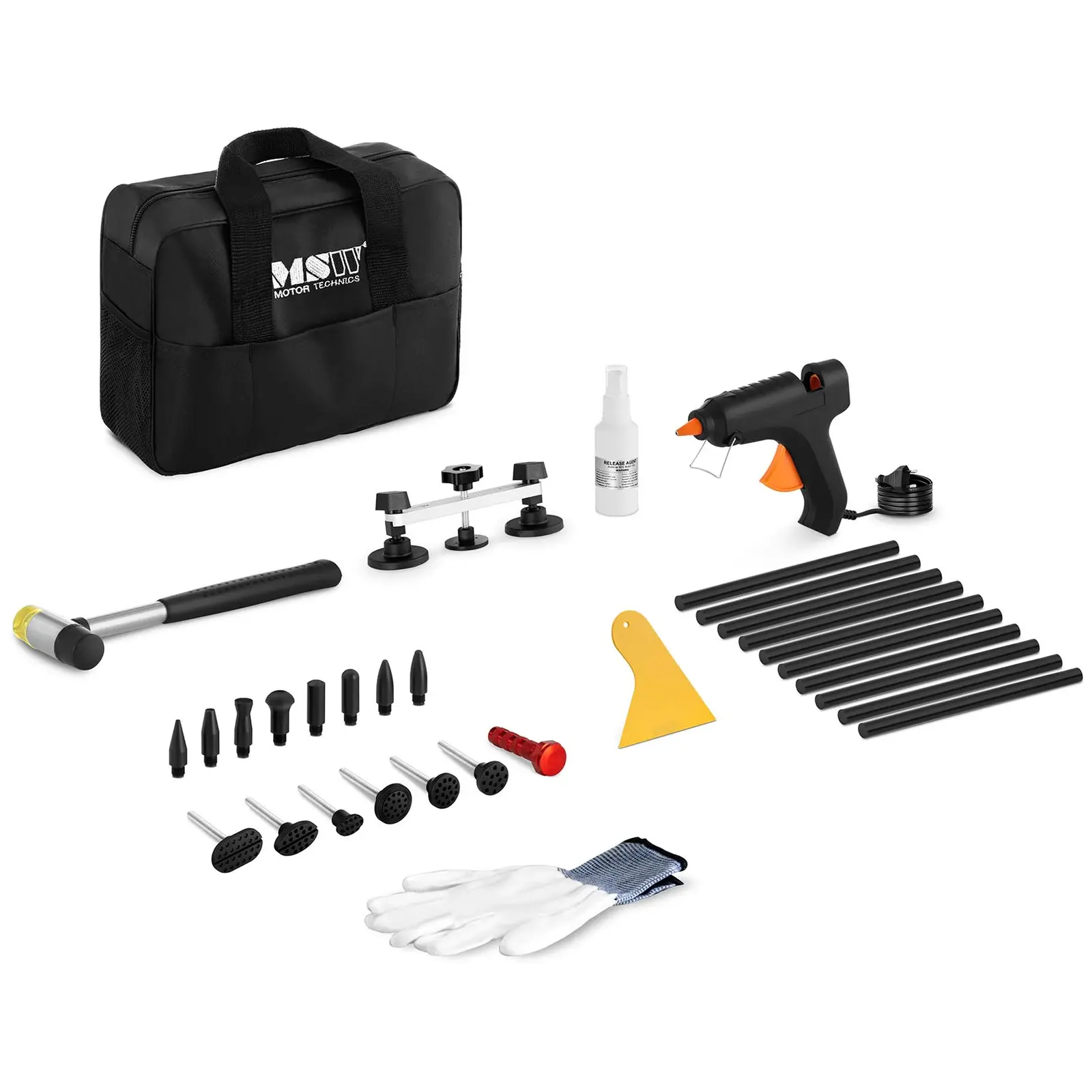 Laaja lommonoikaisusarja MSW-DENTPULLER. SET11 MSW: ltä, ammattimaisten autotyökalujen asiantuntijalta, tarjoaa sinulle kaikki vaihtoehdot pienien ja suurten lommojen tehokkaaseen oikomiseen. Saatavilla on useita lommojen oikaisutyökaluja, joiden avulla voit työstää henkilöautojen, kuorma-autojen tai moottoripyörien koreja erityisen lempeästi. Yksinkertaisen käsittelyn ansiosta sitä voidaan käyttää sekä korjaamoissa että kokeneiden harrastelijoiden autotalleissa. Lommojen oikaisusarja tarjoaa sinulle ihanteellisen työkalun lommojen oikaisuun ilman että sinun tarvitsee purkaa ajoneuvo osiin tai viimeistellä maalipinta uudelleen. Haluatko poistaa pienet kolhut pihdeillä tai suuremmat painaumat liukuvasaralla: Tästä 25-osaisesta sarjasta löydät juuri oikean työkalun kaiken tyyppisille vaurioille. Kiinnitä kahdeksan erilaista vetonuppia käyttämällä 40 W:n kuumaliimapistoolia, joka saavuttaa käyttölämpötilansa noin viidessä minuutissa. Varsinkin jos maalikerroksessa ei näy vaurioita, tämä maalipintaa suojaava lommonoikaisija on ihanteellinen valinta tasoittamaan monenlaisia peltivahinkoja tehokkaasti ja edullisesti. Tämä sarja tarjoaa sinulle lukuisia mahdollisuuksia poistaa erimuotoisia ja -kokoisia rumia kolhuja – olivatpa ne sitten rakeista tai parkkipaikan peltikolareista johtuvia. Käytä PDR-sarjan työkaluja (Paintless Dent Repair) ja säästä sekä aikaa että rahaa korjauksissa. Kun maalipinta on vielä virheetön on PDR-työkalut ihanteellisia ajoneuvon arvon säilyttämiseksi. Lisäksi PDR-työkalujen kompakti koko mahdollistaa vaivattoman kuljettamisen asiakkaiden luo. Sarjaa täydentää laaja valikoima lisävarusteita, joiden avulla voit käyttää yksittäisiä laitteita kunkin korivaurioin vaatimalla tavalla: 10 liimapuikkoa, kaavin, tyhjä pullo liuottimia varten ja työkäsineet.