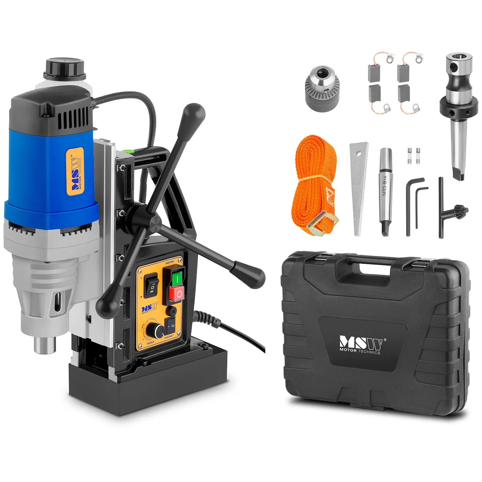 MSW:n magneettiporakoneen 1 380 W:n teho tekee siitä todellisen voimapakkauksen magneettisille alustoille. Sillä ei ole merkitystä, teetkö työtä pysty- vai vaakasuunnassa. Vahva elektromagneettinen jalka pitää koneen tukevasti paikallaan. Magneettiporakone on arvokas ja luotettava apuväline sekä teolliseen että kaupalliseen metallin työstöön. Se sopii poraukseen, upotukseen, kierteytykseen, kalvamiseen ja keernaporaukseen. Metallin työstössä on yksi ominaisuus yli kaiken: teho. MSW:n magneettiporakoneen 1 380 W:n teho jättää kilpailijoiden laitteet kirkkaasti taakseen. Laitteen pyörimisnopeuden voi säätää portaattomasti jopa 600 kierrokseen minuutissa. Tällä liikkuvaan käyttöön suunnitellulla porakoneella suoriudut näppärästi poraamisesta, upotuksesta, kalvamisesta tai keernaporauksesta. Kierteytyksessä on hyötyä vaihdettavasta käytön pyörimissuunnasta. Se estää juuri leikatun kierteen vaurioitumisen, kun kierretappi vedetään ulos. Sähkötyökalun rakenne mahdollistaa helpon ja tarkan työskentelyn. Siinä on kolmivartinen kiertosäädin, jolla saat hyvin tarkan tuntuman poraussyvyyden ohjaukseen välillä 0 ja 175 mm. Koneeseen on integroitu vesivaaka kohdistuksen helpottamiseksi. Tarkka 90° kulma ei näin ole mikään mahdoton vaatimus. Tämän MSW:n ammattilaitevalikoimaan kuuluvan porakoneen sisäänrakennettu jäähdytysainesäiliö tekee siitä äärimmäisen käytännöllisen. Yksinkertaisempia käyttökohteita varten voit täyttää säiliön 300 millilitralla tavallista vesijohtovettä. Jos kyseessä on vaativampi kohde, voit käyttää jäähdytysainetta tai leikkuuöljyä. Tämä lisää poranterän käyttöikää ja pienentää huollon tarvetta. Magneettiporakoneen oma paino on 20 kg, joka riittää mainiosti takaamaan tarkat lopputulokset. Samalla se ei kuitenkaan ole liian painava liikkuvaan teolliseen käyttöön. Kompakti rakenne ja 2 m pitkä verkkojohto tekevät tästä suorituskykyisestä koneesta soveltuvan silloilla, nostureissa, laivoilla tai rakennustyömailla tehtäviin töihin, joiden kohteena ovat magneettiset metallit. Teollisen käytön lisäksi mahdollisia käyttöpaikkoja ovat myös metallia työstävät liikkeet, autokorjaamot ja lukkosepänliikkeet. Suorituskyvyn lisäksi magneettiporakoneen suunnittelussa on panostettu työturvallisuuteen. Sen suurin magneettinen vetovoima on 11 500 newtonia, mikä vastaa yli tonnin massaa ja mahdollistaa myös ohuempien kappaleiden työstön kohteissa, joissa sovellettavissa on vain suuri vetovoima. Lisäturvallisuutta tarjoaa toimitukseen kuuluva kiristyshihna, joka estää työstökappaleiden vauriot tai käyttäjän loukkaantumisen sähkökatkosten tapauksessa. Vikavirtasuoja-magneettikytkin on vielä yksi arvokas lisävaruste. Jos käyttö on vahingossa päällä sähkökatkoksen tai verkosta irrottamisen jälkeen, moottori ei käynnisty. Porakonetta voi ryhtyä käyttämään vasta, kun magneettikytkin on kytketty uudelleen päälle. Lisätarvikkeiden valikoima on kokemuksemme ja asiantuntemuksemme tulosta. Toimitukseen kuuluu istukka halkaisijaltaan enintään 13 mm:n karoille, jäähdytysainesäiliö, varahiiliharjat, sulakkeet, kaikki asennustarvikkeet ja monia muita hyödyllisiä lisävarusteita. Setti on pakattu tukevaan kovamuoviseen kantosalkkuun.