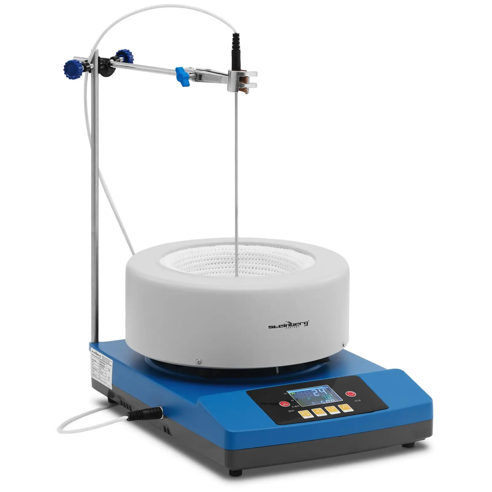 Magneettisekoittaja SBS-LHM-2000 lämmityshauteella sopii ihanteellisesti pyörökolveissa olevien liuosten sekoittamiseen laboratorioissa. Lämmityshaude ympäröi pyörökolvin ja siirtää asetetun lämpötilan tasaisesti liuokseen. Tämän vuoksi lämpöhaude on ihanteellinen kemianteollisuudessa, tutkimustyössä, öljyteollisuudessa ja kaikkialla, missä nestemäisiä aineita on sekoitettava luotettavasti. Magneettisekoittimen lämmityshauteessa on tilaa jopa 2 litran pyörökolveille. Sekoitusnopeus ja lämpötila on säädettävissä mukavasti LED-näytöstä. Magneettisekoittaja lämpöhauteella erottuu edukseen nopealla lämpenemisellään jopa 300 °C saakka. Sekoitusnopeus, jolla magneetti liikuttaa nestettä, voidaan säätää jopa 1 800 r/min asti. Täten myös viskoosien aineiden sekoitus sujuu luotettavasti. Lämmityshaude on integroitu kiinteästi alumiinivalusta valmistettuun koteloon ja tarjoaa alkalitonta lasikuitua olevalla rakenteellaan turvallisen tuen pyörökolveille. Statiivi, koura ja puristin sekä kaksi lämpöanturia sisältyvät toimitukseen, joten voit aloittaa laitteen käytön välittömästi.