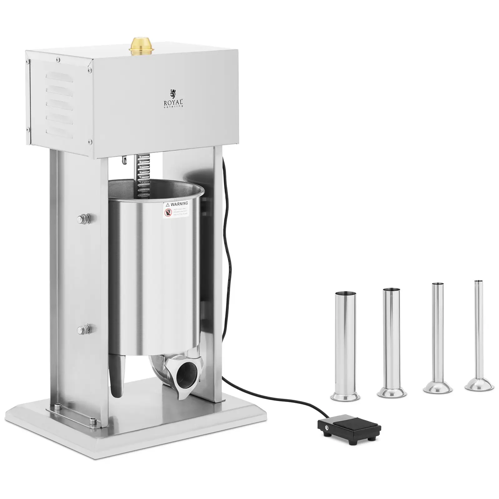 Yksinkertainen on kaunista! Kunnon kotitekoinen makkara on vastustamaton herkku! Royal Cateringin lihanjalostuskoneiden valikoimasta löytyvällä makkarapuristimella valmistat monenlaisia makkaroita tehokkaasti ja parhaalla laadulla. Tämän takaavat laitteen suuri kapasiteetti, tehokas moottori ja molemmat kätesi vapaana pitävä poljin. Makkarapuristin lyömättömillä eduilla sopii ammattikäyttöön erityisesti lihakaupoissa, ravintoloissa tai muissa lihanjalostukseen erikoistuvissa yrityksissä. Tämä sähkökäyttöinen makkarapursotin toimii tehokkaalla 120 W:n moottorillaan ja omaa 10 litran kapasiteetin. Suuri tilavuus ja suorituskyky takaavatkin, että voit valmistaa suuria määriä raakamakkaraa erittäin lyhyessä ajassa. Myös makkarapuristimen käyttö on erittäin yksinkertaista: Voit asettaa nopeuden haluamallesi tasolle laitteen säätimellä. Voit ohjata männän toimintaa polkimella, mikä pitää kätesi vapaina muita työvaiheita varten. Toimitukseen sisältyvillä neljällä täyttöputkella (16, 22, 32, 38 mm) voit työskennellä erittäin joustavasti ja valmistaa juuri haluamasi tyyppistä makkaraa. Voit vaihtaa oikean täyttöputken koneeseen nopeasti ja helposti käsin. Kuten makkarakone itse, myös täyttöputket on valmistettu ruostumattomasta teräksestä. Kaikki makkarakoneen osat ovatkin erittäin korroosionkestäviä, pitkäikäisiä, helppoja puhdistaa ja elintarviketurvallisia. Näin työpisteen puhdistaminen käy aivan yhtä nopeasti kuin makkaroiden valmistaminen!