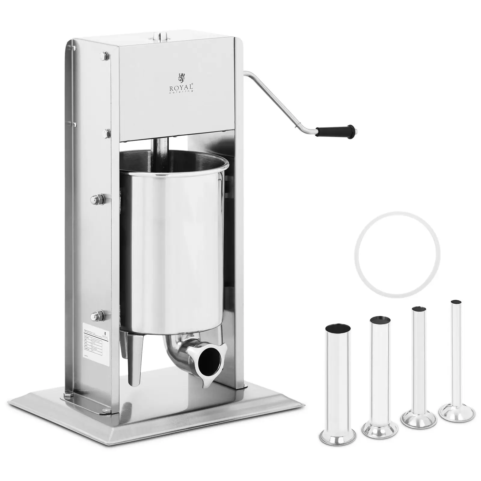 Olipa kyse karkeasta Krakovan makkarasta, pitkästä Thüringenin grillimakkarasta tai paksusta lihamakkarasta – Royal Cateringin korkealaatuisella makkarapuristimella RCWV-10L voit valmistaa käsin monenlaisia makkaroita neljän toimitetun putken ansiosta. Tämä tekee makkarapuristimesta 10 l sisällöllä hyödyllisen apurin ravintoloissa, lihakaupoissa, ruokaloissa ja myös kotikeittiöissä. Hygieenisestä ruostumattomasta teräksestä valmistetussa makkaran täyttölaitteessa on korkealaatuinen vaihteisto kahdella vaihteella. Ergonomisesti muotoillun käsikammen avulla voit täyttää makkarat tasaisesti lihalla kahdella eri nopeudella. Lähellä koteloa sijaitseva kampi takaa optimaalisen voimansiirron ja vakaamman jalustan kuin vastaavat tuotteet, joiden kampi sijaitsee ulompana. Silikonitiiviste estää täyttöaineen ylipursuamisen ulos sylinteristä. Jos haluat täyttää halkaisijaltaan 21,5 cm sylinterin makkaralihalla, sinun tarvitsee vain avata ja irrottaa se. Säiliö voidaan täyttää käsin tai suoraan lihamyllystä. Se, että täydellinen makkarapuristin on valmistettu elintarviketurvallisesta ja kestävästä ruostumattomasta teräksestä, tarkoittaa sylinterin ja yksittäisten osien helppoa puhdistamista. Haluamastasi täytteestä ja makkaratyypin paksuudesta riippuen kiinnitä yksi 18 cm pitkistä täyttöputkista, joiden halkaisija on 16, 22, 32 tai 38 mm, aukon kierteeseen. Kätevän kiristysmutterin ansiosta voit vaihtaa täyttöputken nopeasti ja kiinnittää sen alaosasta löytyvään 27 cm korkeaan sylinteriin. Makkarakoneen pystysuora rakenne vie myös vain vähän tilaa työpisteelläsi.