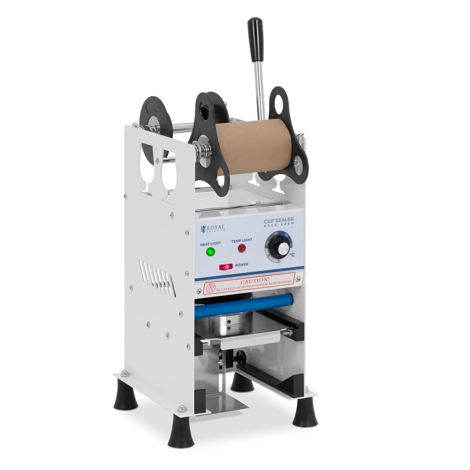 Paranna pitopalvelusi, kahvilasi tai ravintolasi tuottavuutta pirtelöiden, kuplateen, jääkahvin tai smoothien osalta! Manuaalisella sulkemiskoneella voit nopeasti ja turvallisesti pakata juomat muovikuppeihin, joiden vakiohalkaisija on 95/90 mm tai 95/75 mm. Kone sinetöi kupit kalvolla (ei sisälly toimitukseen), jonka se levittää sinetöintimuotin päälle kelojen avulla ja syöttää sitten koneen läpi. Kaikki koneen komponentit on sovitettu tarkasti yhteen, ja ne mahdollistavat jopa 500 kupin käsittelyn tunnissa. Korkea tuotantonopeus kulkee käsi kädessä tiivistyslaitteen helppokäyttöisyyden kanssa. Voit asettaa lämpötilan 0 – 250 °C:n välille selkeällä ohjauspaneelilla sulattaaksesi PP-, PE- tai PET-mukit ja kalvon yhteen. Lisäksi voit säätää kuppien tason korkeutta 180 mm:iin asti, jolloin ne pysyvät aina tukevasti pystyssä. Paina kalvo vivun avulla kupin reunaan kiinni, jolloin se sinetöityy luotettavasti. Näin juoma on valmis otettavaksi mukaan! Kalvorullien kotelo, kuppien taso ja koneen rullat on valmistettu vakaasta ja tukevasta hiiliteräksestä. Tämän ansiosta ne ovat kestäviä ja sopivat jokapäiväiseen käyttöön. Kupinsinetöintikone seisoo luistamattomien kumijalkojen päällä, joten laite on vakaa myös suurella tuotantonopeudella.