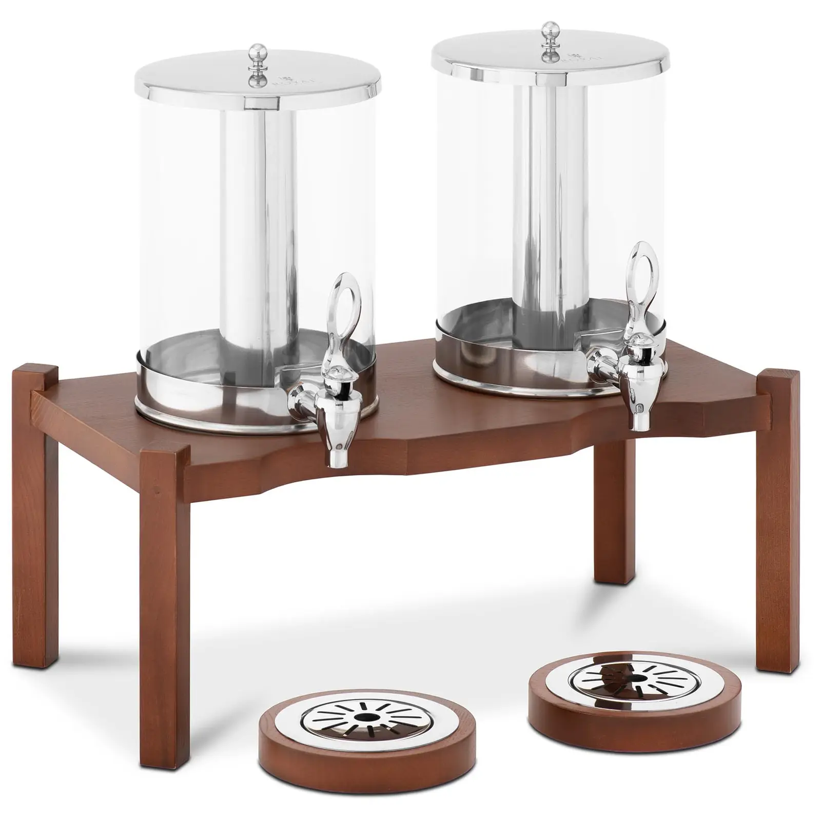 Kun kylmää juomaa, kuten vettä, jääteetä, maitoa tai hedelmämehuja halutaan laittaa itseotettavaksi tarjolle, on Royal Cateringin kahdella säiliöllä varustettu, laadukas menuannostelija RCSD-2W3 juuri se mitä tarvitset, olipa kyseessä sitten hotellin aamiaisbuffet, ravintola tai seuraavat puutarhajuhlasi. 2 x 7 litran sisältö voidaan haluttaessa jäähdyttää helposti ja tehokkaasti ja esittää asianmukaisesti. Hana-annostelija on valmistettu kestävistä ja makuneutraaleista materiaaleista. Kaksi halkaisijaltaan 200 mm olevaa sylinterimäistä säiliötä seisovat tukevasti puujalustalla. Läpinäkyvän muovin ansiosta vieraasi voivat nähdä tarkalleen, mitä virvokkeita on tarjolla ja itse näet, milloin säiliöt on jälleen täytettävä. Tämä käy erittäin helposti ja ilman roiskeita kantta nostamalla. Lisäksi kaikki materiaalit ovat naarmuuntumattomia ja helposti puhdistettavia. Tiiviit ruostumattomasta teräksestä valmistetut jäähdytysjärjestelmät on täytetty jääpaloilla ja ne varmistavat, että tarjolla olevat juomat jäähdytetään tasaisesti ilman juomien vetistymistä. Tämä takaa vieraille puhtaan ja kylmän juomanautinnon. Koristeellisen juoma-annostelijan hanojen alle mahtuvien juomalasien korkeus on 190 mm, mikä vastaa tavanomaisia laseja. Helppokäyttöisten hanojen ansiosta myös lasten on mahdollisuus täyttää mehua tai jääteetä laseihinsa. Irrotettavat tippa-astiat keräävät muutamat lasista mahdollisesti ohimenevät pisarat juomaa otettaessa. Täten buffettisi pysyy aina puhtaana ja antaa itsestään vieraillesi moitteettoman vaikutelman. Lisäksi hanojen ripeän valumisnopeuden ansiosta pitkät jonot kuuluvat buffettien juomanhakupisteillä menneisyyteen. Jäähdytysjärjestelmän sisältämä mehuannostelija on jokaisen buffetin kohokohta.