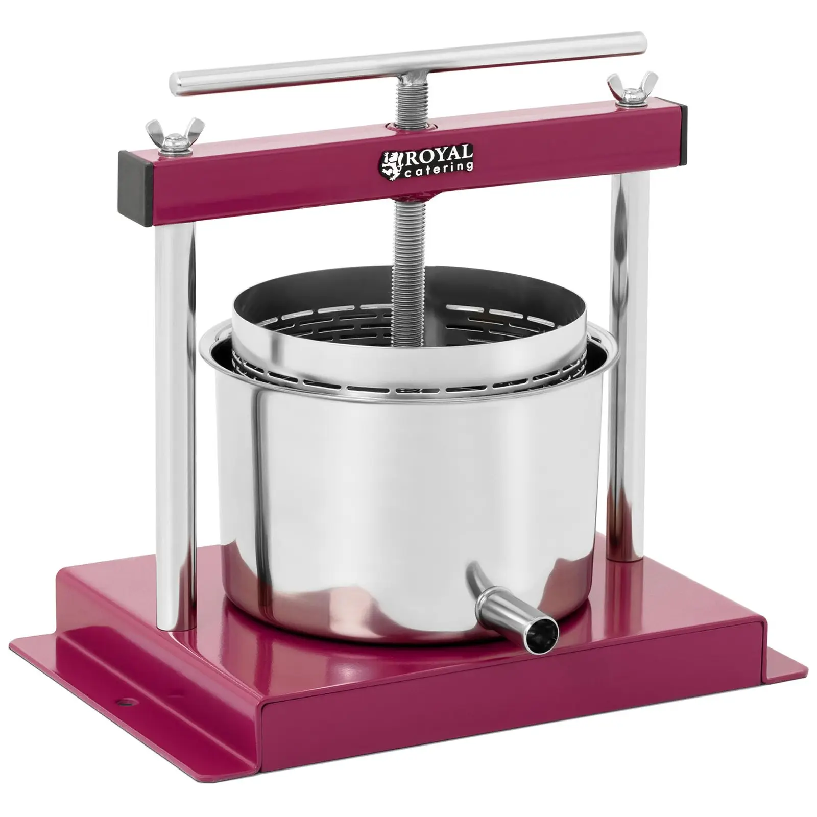 Royal Cateringin keittiövälineisiin kuuluva hedelmäpuristin RCWP-3L on ihanteellinen suurien hedelmämäärien mehustamiseen pienellä vaivalla. Mehupuristin toimii käsin ja sopii omenoille, viinirypäleille, marjoille ja muille hedelmille. Pienestä koostaan huolimatta hedelmäpuristin omaa suuren tilavuuden, jonka ansiosta se soveltuu sekä ammattikäyttöön että mehun ja viinin valmistukseen kotitalouksissa. Perinteisen puun ja raudan sijaan on tämän hedelmäpuristimen hedelmäkori ja keräyskulho valmistettu ruostumattomasta teräksestä kestävyyden ja hygienian vuoksi. Hedelmäpuristin toimii kuitenkin samalla tavalla kuin 100 vuotta sitten: kairan rakenne saa aikaan korkean paineen pienellä vaivalla, jonka ansiosta mehu voidaan irrottaa kokonaan ulos hedelmistä. Hedelmäpuristimen tilavuus on 3 l, joten sen voi täyttää suurella määrällä hedelmiä, jotka voidaan mehustaa yhdessä työvaiheessa. Kartiopohjassa on nokka, joka varmistaa, että valmistettu hedelmämehu voidaan pullottaa suoraan ilman hävikkiä. Vakaasta pohjalevystä löytyy reikiä pohjan alustaan kiinni ruuvamista varten, jotta se olisi mahdollisimman tuettu. Näin vipua voi vetää voimakkaasti ja tehokkaasti, jolloin voidaan tuottaa enimmäismäärä mehua. Koska mehupuristinta on käsin käytettävä, soveltuu se myös erinomaisesti käytettäväksi ulkona tai missä tahansa, missä sähkö on vaikeasti tai ei lainkaan saatavilla. Vinkki: mehuja ja viinejä voidaan tuottaa vielä nopeammin, jos hedelmät murskataan myllyllä etukäteen. Valikoiman mehupuristimia kotitekoisten mehujen valmistusta varten löydät myymälämme keittiöväline-kategoriasta.