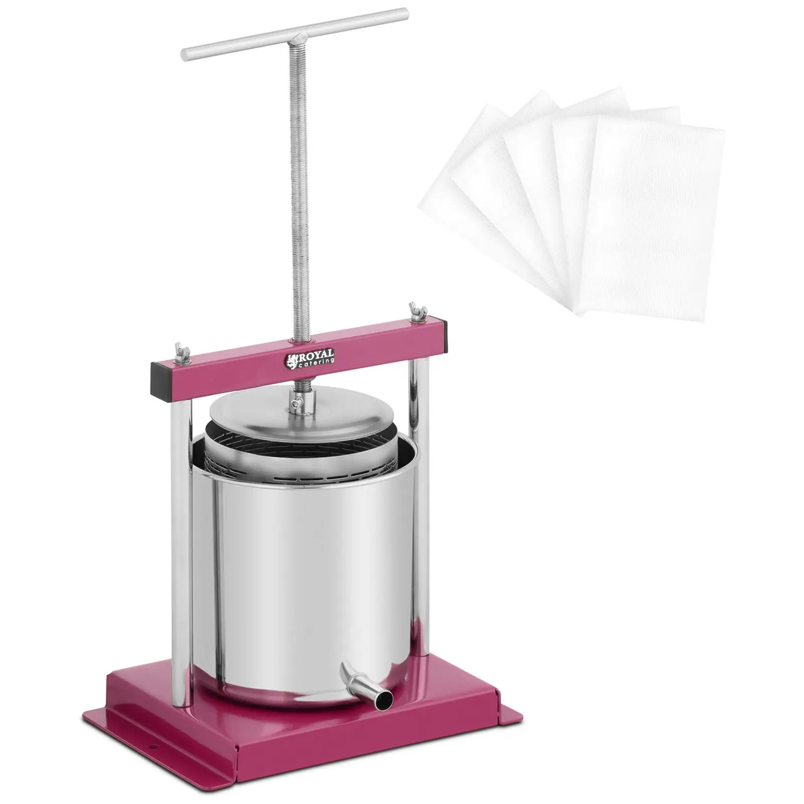 Royal Cateringin keittiövälineisiin kuuluva mehupuristin on ihanteellinen suurten hedelmämäärien mehustamiseen pienellä vaivalla. Käsikäyttöinen hedelmäpuristin sopii omenoille, viinirypäleille, marjoille ja muille hedelmille. Pienestä koostaan huolimatta hedelmäpuristin omaa suuren tilavuuden, jonka ansiosta se soveltuu sekä ammattikäyttöön että mehun ja viinin valmistukseen kotitalouksissa. Perinteisesti puusta ja raudasta valmistettu hedelmäpuristin on tässä mallissa päivitetty ruostumattomalla teräksellä, joka takaa puristimen kestävyyden ja hygieenisyyden. Omenapuristimen toimintatapa on kuitenkin sama kuin jo vuosisata sitten: kararakenteen ansiosta saat pienellä vaivalla aikaan erittäin korkean paineen, joka puristaa mehun hedelmistä tehokkaasti ulos. Hedelmäpuristimen tilavuus on 5 l, joten voit täyttää sen suurella määrällä hedelmiä ja mehustaa ne kerralla. Puristimen pohjassa on nokka, jonka avulla keräät puristetun mehun talteen ilman hävikkiä. Mehuprässin vakaassa rautapohjassa on ruuvinreiät, joiden avulla voit kiinnittää sen tukevasti alustaan. Näin voit vääntää puristimen vivusta suurellakin voimalla, jolloin saat puristettavista hedelmistä viimeisetkin mehupisarat irti. Tällainen käsikäyttöinen omenapuristin toimii ilman virtaliitäntää, joten voit käyttää sitä monipuolisesti myös ulkona. Vinkki: Parhaan tuloksen aikaansaamiseksi käytä puristamiseen sopivan kokoista suodatinliinaa. Toimitukseen sisältyy 5 sopivaa liinaa. Hedelmien vaivattomaan pilkkomiseen ennen puristamista suosittelemme valikoimamme murskaimia ja silppureita.
