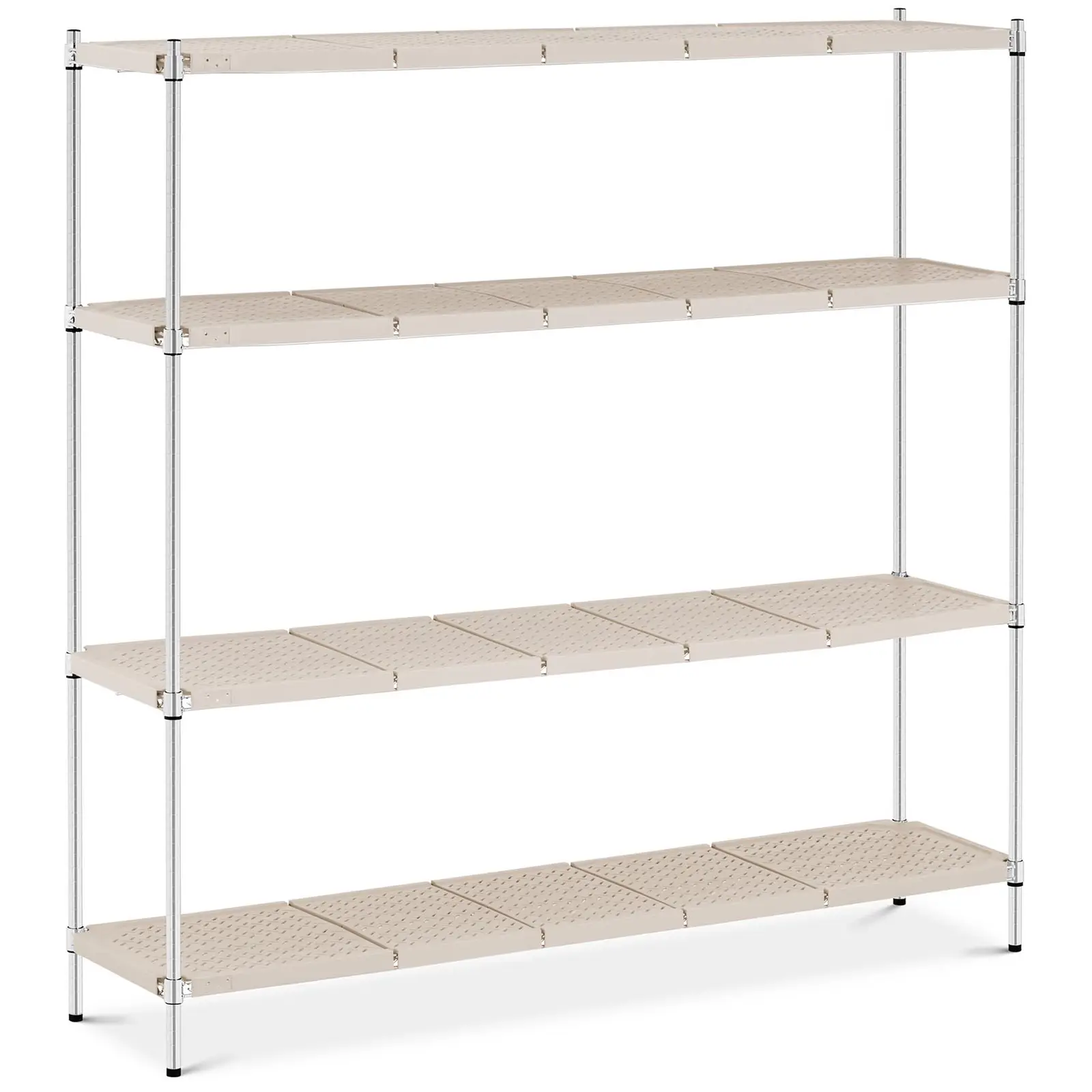 Royal Cateringin metallihylly RCMR- 1800P24 on suunniteltu kaupalliseen, teolliseen tai yksityiseen käyttöön. Hylly tarjoaa paitsi valtavan määrän säilytystilaa ja tukevan jalustan, niin se myös vakuuttaa epoksipinnoitteen ansiosta erityisen pitkällä käyttöiällään- kosteissakin tiloissa. Tilavassa teräshyllyssä on neljä 180 x 45 cm ristikkohyllyä pestävillä muovialustoilla, mikä takaa runsaan säilytystilan: seisoopa se sitten hotellissa, työpajassa, ravintolassa tai supermarketissa, kotona autotallissa, keittiössä tai kellarissa. Kullakin tasolla voidaan säilyttää enintään 150 kg, joten hyllyn kokonaiskuormitus on enintään 600 kg. Kuormitettavan hyllyn avoin muotoilu tarkoittaa, että hyllyyn asetettuihin tavaroihin pääsee helposti käsiksi kaikilta puolilta. Hyllyn kokoamiseen et tarvitse työkaluja ja siihen kuluu vain muutama minuutti, koska yksittäiset osat on vain kiinnitettävä ja lukittava paikoilleen. 25 mm paksuisten pylväiden ansiosta tämä hylly on vähintään yhtä vakaa kuin tavanomaisilla ruuviliitoksilla varustetutkin rakenteet. Neljän säädettävän tasoitusjalan ansiosta lattian epätasaisuudet voidaan tasoittaa ja hylly seisoo aina suorassa. Metallihyllyssä on lisäksi tyylikäs ja suojaava epoksipinnoite. Tämän pintakäsittelyn ominaisuudet tekevät mallista ihanteellisen sekä kuivissa että kosteissa ympäristöissä käytettäväksi. Materiaali kestää korroosiota ja varastointia. Sileä pinta on myös helppo puhdistaa avoimen muotoilun ansiosta.