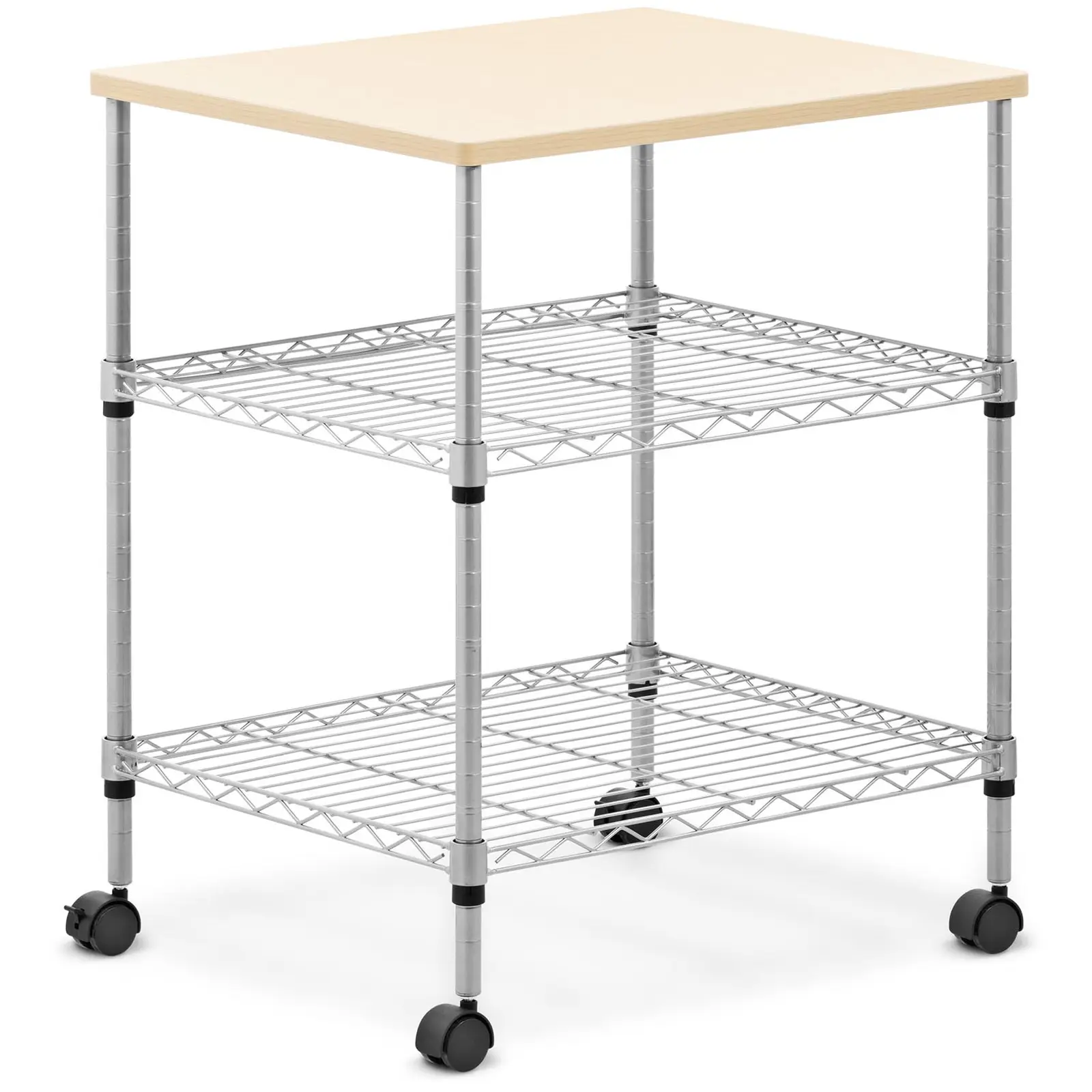 Royal Catering on suunnitellut tämän metallihyllykön niin kaupalliseen, teolliseen kuin yksityiseenkin käyttöön. Tässä metallihyllyssä on paljon säilytystilaa ja se on erittäin pitkäikäinen. Voit työntää metallihyllyn sen 1,5 tuuman kokoisten pyörien varassa mukavasti juuri sinne, missä sitä ja siinä säilytettyjä tavaroita parhaillaan tarvitset – olipa kyseessä toimisto, etätyöpaikka, kylpyhuone tai liiketilat. Tässä tilavassa metallihyllykössä on kolme hyllytasoa, joiden mitat ovat 550 x 450 mm. Tähän hyllyyn mahtuu paljon säilytettävää! Ylin hyllytaso on valmistettu 18 mm paksusta MDF-levystä, kaksi alempaa ovat tukevia teräsritilöitä, jotka voi yhden tuuman (2,54 cm) pykälin sijoittaa mihin korkeuteen tahansa. Jokaisen hyllytason suurin kuormitettavuus on 10 kg, mikä tarkoittaa, että hyllykön kokonaiskuormitettavuus on 30 kg. Koska sen rakenne on avoin, hyllykössä oleviin tavaroihin pääsee esteettä käsiksi kaikilta puolilta. Metallihylly kootaan työntämällä sen osat yhteen. Lopputuloksena on tukeva hyllykkö, jonka kuormitettavuus on jopa suurempi kuin tavallisin ruuviliitoksin koottavien mallien. Metallihyllyn kehikko muodostuu neljästä pyörötangosta, joiden korkeus on 69 cm. Kaikki kokoamiseen tarvittavat osat sisältyvät toimitukseen. Kokoaminen käy hyvin helposti etkä tarvitse siihen mitään lisätyökaluja. Metallihyllyssä on sitä suojaava tyylikäs pinnoite. Tämä suojaava pintakäsittely tekee tästä mallista ihanteellisen sekä kuiviin että kosteisiin ympäristöihin. Materiaali ei ole herkkä korroosiolle eikä sille helposti kerry pinttynyttä likaa.