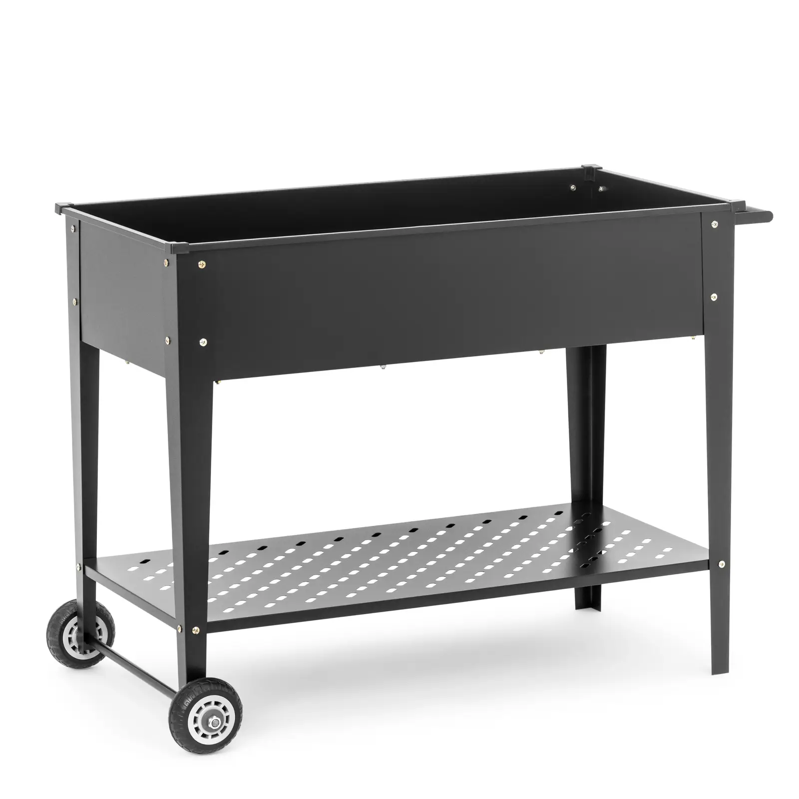 Laita puutarhanhoitokausi käyntiin Uniprodon metallisella istutuslaatikolla! Tukeva istutuslaatikko parvekkeelle, terassille tai puutarhaan on oikea tilaihme. Käytännöllisen korkeuden ansiosta voit hoitaa istutustyöt mukavasti ilman selkäkipuja. Laatikon runko on valmistettu säänkestävästä teräksestä, ja sen alaosassa on kätevä säilytyshylly. Hylly on ihanteellinen ratkaisu lapioiden, mullan, kukkaruukkujen tai muiden kasvien säilyttämiseen. Istutuslaatikko on myös helppo kuljettaa haluttuun paikkaan sen kahden pyörän avulla. Mehukkaita tomaatteja ja aromaattisia yrttejä: Tee puutarhanhoidosta hauskaa ja nauti satosi maukkaista antimista. Tämä jalallinen istutuslaatikko on nopea koota käyttövalmiiksi. Yksinkertaisen rakenteen ansiosta kokoaminen onnistuu 5 minuutissa. Laatikon runko on valmistettu 0,6 mm paksusta galvanoidusta teräksestä. Näin se on suojattu ruosteelta, tuulelta sekä huonolta säältä ja tarjoaa sinulle riemua todella pitkään. Viljelylaatikko tekee vaikutuksen tyylikkäällä muotoilullaan ja käytännöllisillä lisävarusteillaan. Kahden suuren pyörän ja laatikon sivussa olevan kahvan ansiosta voit siirtää viljelylaatikon helposti haluamaasi paikkaan. Lisäksi sen pohjassa on poistoaukko, jonka kautta ylimääräinen kastelu- ja sadevesi pääsee valumaan laatikosta ulos.