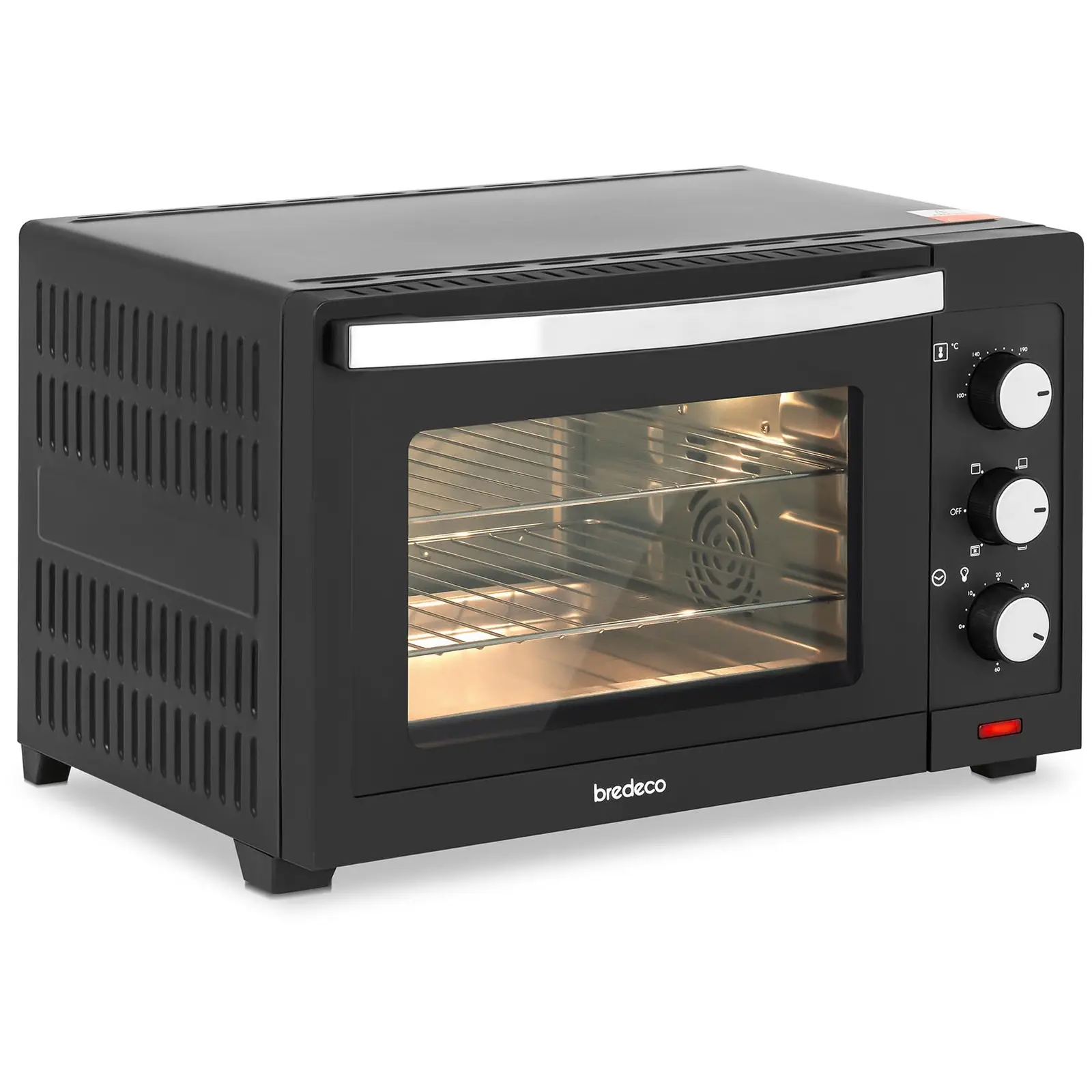 Miniuuni bredecolta on pienillä mitoillaan ja vähäisellä energiankulutuksellaan ihanteellinen pieniin keittiöihin, yhden hengen kotitalouksiin, asuntoautoihin ja loma-asuntoihin. 1 600 W tehollaan ja yllättävän suurella sisätilallaan valmistat pöytäuunilla lämpimien voileipien ja välipalojen lisäksi myös pitsoja ja laatikkoruokia. Jopa 230 °C lämpötilalla ja kiertoilmatoiminnolla miniuuni mahdollistaa tasaisen kypsennyksen ja optimaaliset tulokset. Jokaiseen makuun ja jokaiseen ruokaan on olemassa sopiva ohjelma, käytitpä sitten ylä- tai alalämpöä. Entistä helpompaa uunin käytöstä tekee ajastin, joka on säädettävissä 60 min saakka. Automaattinen termostaatti takaa tasaisen lämpötilan käytön aikana – tämä on edullista ruuille sekä pienentää sähkönkulutusta. Myös kaksikerroksinen, karkaistua lasia oleva ovi takaa energiatehokkuuden ovikerrosten välissä olevan ilmakerroksen toimiessa eristeenä. Lasioven ja valaistuksen ansiosta kypsennysprosessin tarkkailu on ongelmatonta ilman, että uunia on välillä avattava. Liukumattomat jalat takaavat hyvän pidon ja ehkäisevät alustan naarmuuntumista. Uunin toimituksen sisältöön kuuluvat syvä pelti sekä kaksi ritilää. Niitä voidaan siirrellä tarvittaessa eri tasoille uunissa. Sekä peltiin että ritilään sopiva kahva takaa kuumien ruokien turvallisen pois oton.