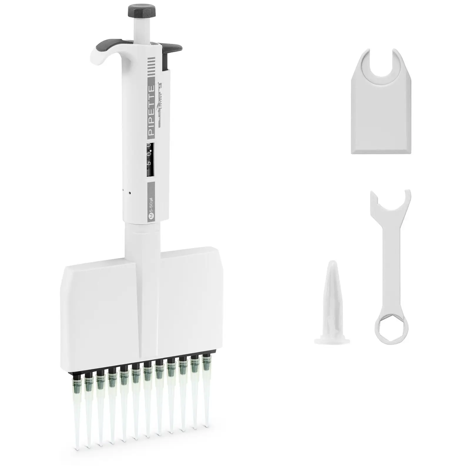 Tämä Steinberg Systemsin monikanavainen pipetti tekee laboratoriotyöstäsi nopeampaa ja ergonomisempaa. Jatkuvan näpertämisen sijaan, kuten yksikanavaisella pipetillä, tällä laitteella voit siirtää napin painalluksella 12 näytettä kerrallaan. Kevyt ja helppokäyttöinen pipetti sopii erinomaisesti nesteiden siirtämiseen laboratorioissa, kouluissa tai kotona. 12-kanavainen pipetti on varustettu tarkkuusjousella, joten voit painaa painiketta alas pienellä voimalla ottaaksesi ja annostellaksesi näytteitä. Painike myös palaa alkuperäiseen asentoonsa aivan yhtä sulavasti. Näin voit työskennellä pitkään väsymättä. Käyttö on mahdollista yhdellä kädellä. Ohjaat haluttua annostelumäärää kääntämällä mäntää. Tukevassa kahvassa on selkeä, kolminumeroinen tilavuusnäyttö. Pipetin pää kääntyy 360° näytteenoton helpottamiseksi. Voit poistaa käytetyt kärjet nopeasti ja helposti tällä 12-kanavaisella pipetillä ja näin valmistella laitteen seuraavaa käyttöä varten. Kärjet poimitaan yhtä helposti kuin yksikanavaisella pipetillä: Aseta monikanavainen pipetti suoraan kärkien päälle. Poimi nyt kärjet kevyellä, tasaisella paineella, kunnes tunnet vastapainetta. Kun kärjet on kiinnitetty, aseta pipetti pystysuoraan nesteeseen. Kun siirrät näytteitä, kallista pipettiä hieman ja anna kärkien koskettaa astian seinämiä, jotta neste valuu hallitusti. 12-kanavainen pipetti on valmistettu muovista. Materiaali on kestävää ja erityisen kevyttä – ihanteellinen tarkkaan työhön laboratoriossa, apteekissa ja lääketieteellisessä ympäristössä.