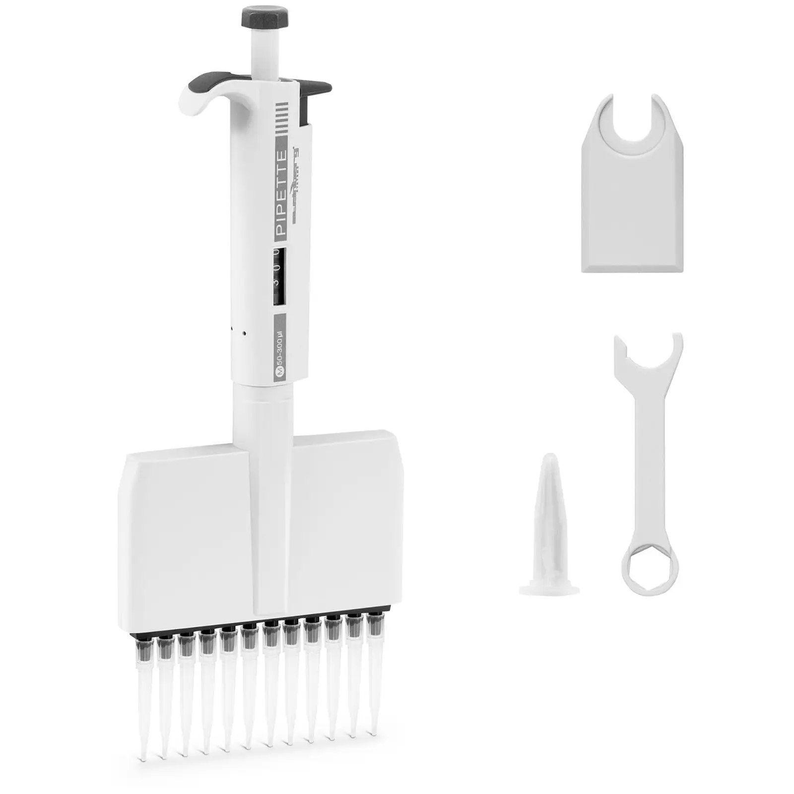 Tämä Steinberg Systemsin monikanavainen pipetti tekee laboratoriotyöstäsi nopeampaa ja ergonomisempaa. Jatkuvan näpertämisen sijaan, kuten yksikanavaisella pipetillä, tällä laitteella voit siirtää napin painalluksella 12 näytettä kerrallaan. Kevyt ja helppokäyttöinen pipetti sopii erinomaisesti nesteiden siirtämiseen laboratorioissa, kouluissa tai kotona. 12-kanavainen pipetti on varustettu tarkkuusjousella, joten voit painaa painiketta alas pienellä voimalla ottaaksesi ja annostellaksesi näytteitä. Painike myös palaa alkuperäiseen asentoonsa aivan yhtä sulavasti. Näin voit työskennellä pitkään väsymättä. Käyttö on mahdollista yhdellä kädellä. Ohjaat haluttua annostelumäärää kääntämällä mäntää. Tukevassa kahvassa on selkeä, kolminumeroinen tilavuusnäyttö. Pipetin pää kääntyy 360° näytteenoton helpottamiseksi. Voit poistaa käytetyt kärjet nopeasti ja helposti tällä 12-kanavaisella pipetillä ja näin valmistella laitteen seuraavaa käyttöä varten. Kärkien poimiminen on yhtä helppoa kuin yksikanavaisella pipetillä: aseta monikanavainen pipetti suoraan kärkien päälle. Poimi nyt kärjet kevyellä, tasaisella paineella, kunnes tunnet vastapainetta. Kun kärjet on kiinnitetty, aseta pipetti pystysuoraan nesteeseen. Kun siirrät näytteitä, kallista pipettiä hieman ja anna kärkien koskettaa astian seinämiä, jotta neste valuu hallitusti. 12-kanavainen pipetti on valmistettu muovista. Materiaali on kestävää ja erityisen kevyttä – ihanteellinen tarkkaan työhön laboratoriossa, apteekissa ja lääketieteellisessä ympäristössä.