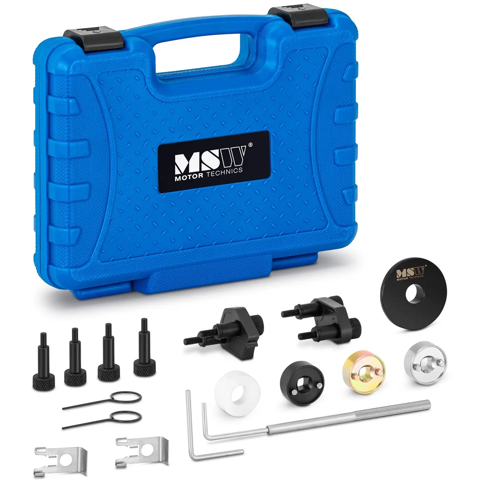 Haluatko korjata 1,8 TSI / TFSI tai 2. 0 TSI / TFSI nelisylinterisen moottorin Audista, Seatista, Skodasta tai VW:sta: Laadukkaiden autotyökalujen asiantuntijoiden MSW: n MSW- ETT-21- moottorin ajoitustyökalulla voit lukita nokka-akselin tai kampiakselin hetkessä ohjausketjun vaihtoa varten, voit kiinniittää tai irrottaa nokka-akselin tai suorittaa muita säätöjä vaivatta. Nokka-akselin säätötyökalulla voit suorittaa monimutkaisiakin töitä eri ajoneuvomalleissa, joissa on 1. 8 TSI/TFSI tai 2. 0 TSI/TSFI-bensiinimoottori. Tämä ammattikäyttöinen työkalu on suunniteltu sopimaan optimaalisesti vastaaviin moottorinosiin ja on siksi helppokäyttöinen. Moottorin ajoitustyökalu takaa tehokkaimman tavan moottorin lukitsemiseen ja säätämiseen. Työskentely muiden kaupallisesti saatavien työkalujen kanssa voi vahingoittaa moottorinosia tai johtaa jopa käyttäjän loukkaantumiseen. Lisäksi MSW: n työkalusarja varmistaa, ettei kulumisia juuri synny. Toimitukseen sisältyviin korkealaatuisiin työkaluihin kuuluu neljä lukitustappia nokka-akselille, kaksi kiinnikettä sekä nokka-akselille että ketjun kiristimelle, kaksi kohdistustappia, nokka-akselin säätimen irrottamistyökalu, painolevy, tarkistusuurna, kohdistustyökalu ja painekappale akselitiivisteen suojaamiseksi. Vankasta ja kestävästä teräksestä ja alumiinista valmistetut työkalut tarjoavat sinulle monen vuoden uskollisen palvelun, eikä niiden siksi pitäisi puuttua mistään ammattiautokorjaamosta tai kunnianhimoisesta harrastelijamekaanikon autotallista! Asiakaskäynneillä voit säilyttää kaikki osat puhtaasti ja turvallisesti tukevassa muovisessa kuljetuslaukussa. Näin sinulla on aina työkalut järjestyksessä ja kaikki on saatavilla heti, kun työkaluja tarvitaan.