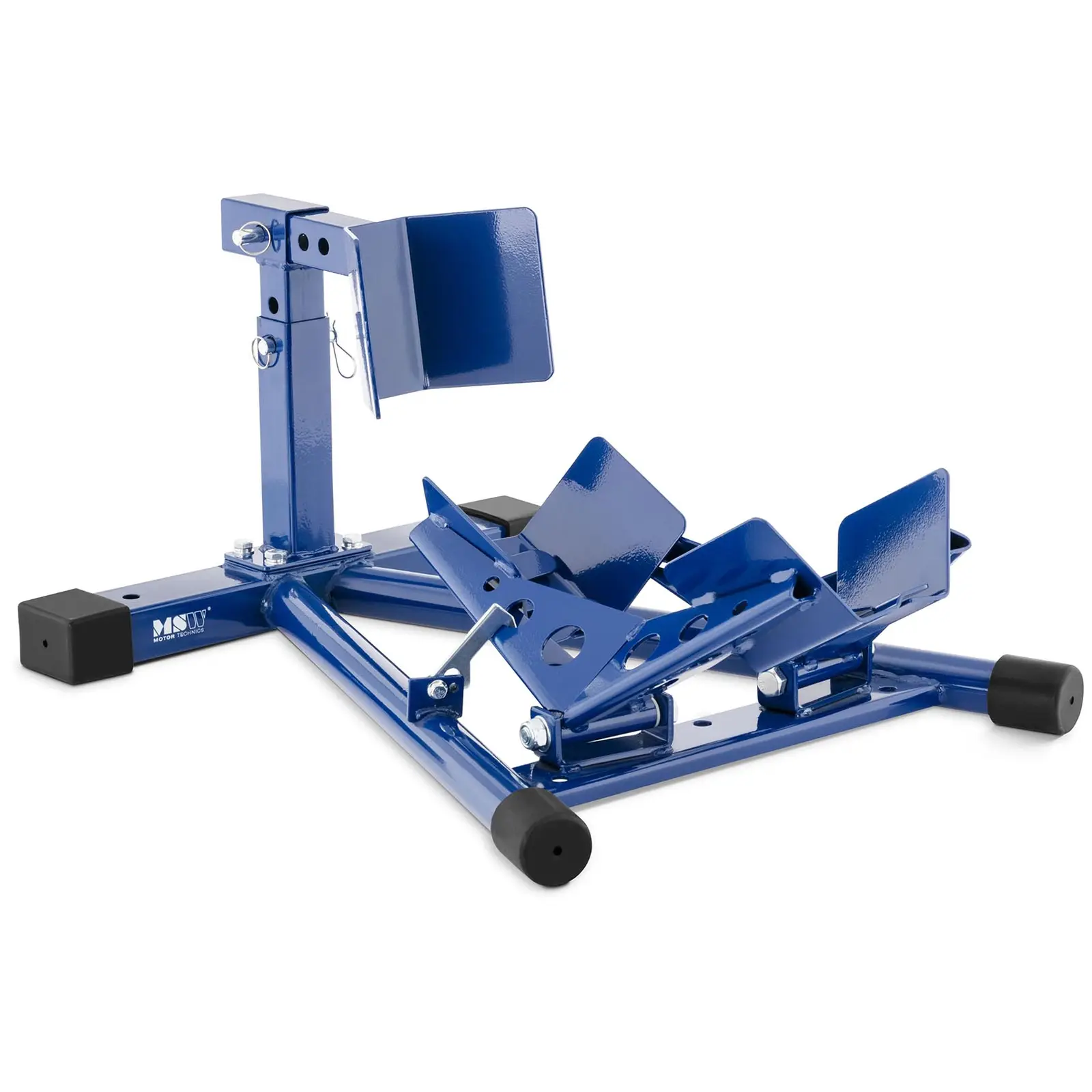 Jos haluat pysäköidä, kuljettaa tai varastoida moottoripyörän: MSW: n MSW-MS-12-moottoripyörän tuki auttaa pitämään ajoneuvoa helposti ja tehokkaasti paikoillaan. Käytännöllisen taittomekanismin ansiosta moottoripyöräteline on kompakti, vakaa ja joustava. Moottoripyörän jalusta on yksinkertainen, tehokas ja täydellinen lisä moottoripyörälle tai moottoripyöräkorjaamoon. Laaja jalusta mahdollistaa sen käytön vapaasti seisovana tai kiinnitettynä. Aina kun tarvitset moottoripyörätukea, sen vankka teräsrakenne pitää 200 kg:n moottoripyörän turvallisesti pystyssä. Moottoripyörän tuen keinuva rakenne pitää huolen siitä, että eturengas kiinnittyy jalustaan sen sisäänajaessa ja näin se on tukevasti kiinnitetty. Telinettä voidaan säätää optimaalisesti ja se on suunniteltu renkaille, joiden koko on 8 – 16 cm. Näin ollen suurin osa moottoripyöristä mahtuu siihen. Kiinnitä moottoripyörä huoltotöitä varten tai säilytä sitä turvallisesti talven ajan etupyörätuessa. Etupyöräjalusta tarjoaa myös riittävän tuen perävaunulla tapahtuvalle kuljetukselle, jolloin voit kiinnittää ajoneuvon kiinnityshihnoilla tukeen kiinni.
