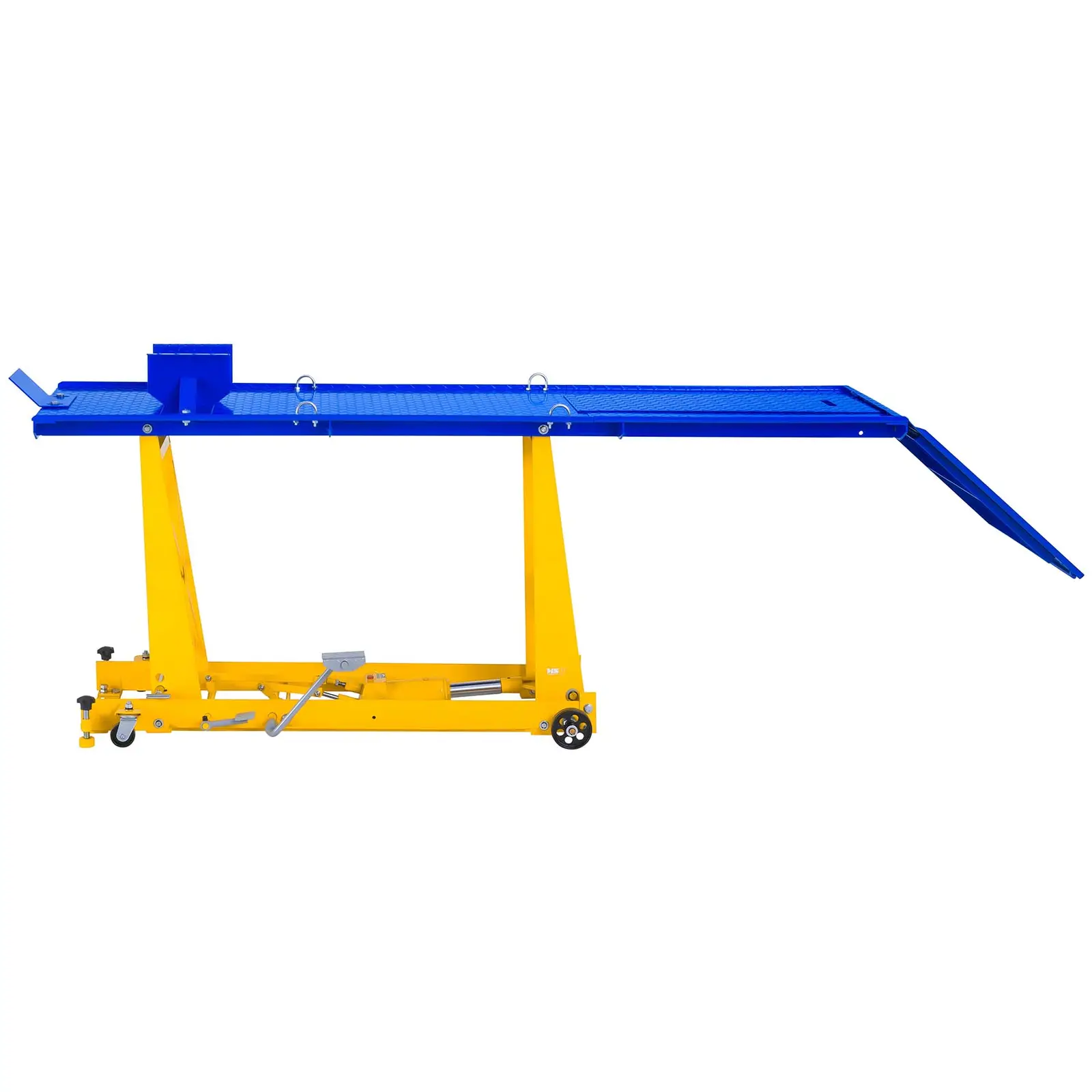 MSW Motor Technics:n MSW-MHB-450-780. 2 moottoripyöränostin 450 kg kantokyvyllään mahdollistaa moottoripyörän noston korjausta tai huoltoa varten miellyttävälle työkorkeudelle. Moottoripyörä voidaan siirtää nostolavalle yksinkertaisesti ramppia pitkin. Moottoripyörä voidaan kiinnittää lavan etupuolella olevaan pyörän pidikkeeseen. Lisäksi lavan sivuilla on neljä u-kiinnikettä, joiden avulla Moottoripyörä voidaan kiinnittää tukevasti hihnan avulla. Lavan takaosassa on asennuslevyn alla pyörän vaihtoakseli, jota voidaan käyttää esimerkiksi takarenkaan huoltotöissä. Lavan nosto ja lasku ei vaadi sähköä, koska nostohissi on ohjattavissa helposti kahdella jalkapolkimella ja näin saavutetaan haluttu korkeus 18 ja 78 cm väliltä. Laskunopeus on säädettävissä tarkkaan ja turvalliseen työtason laskuun. Lava tarjoaa 220×68 cm pinta-alallaan reilusti tilaa moottoripyörän erilaisten huolto- ja korjaustöiden tekemiseen. Näin lava soveltuu myös seisontatuellisille pyörille. Lavan pinta on uurrettu, joten pyörän siirtäminen lavalle onnistuu turvallisesti. Etupyörän edessä oleva este lisää työturvallisuutta kiinnitettäessä pyörää pidikkeeseen. Etupyörän pidike, jonka leveys on 7 – 18 cm koostuu ruuvipuristimesta, käyttömukavasta kammesta sekä kahdesta kiristysleuasta, joiden avulla etupyörä kiinnitetään tukevasti ja sen jälkeen kiinnitystä voidaan tukea vielä hihnoilla. Kiristysleuat on päällystetty kumilla, jolloin kiinnitys ei vahingoita pyörää. Moottoripyöränostin on varustettu neljällä pyörällä, joista kaksi on pyörivää niin, että nostolavaa voidaan siirtää paikasta toiseen joustavasti. Varman paikallaan pysymisen takaavat kaksi kiinnitysruuvia, jotka estävät etupyörien liikkeen ja estävät täten vaunun liukumisen epätasaisellakin lattialla.