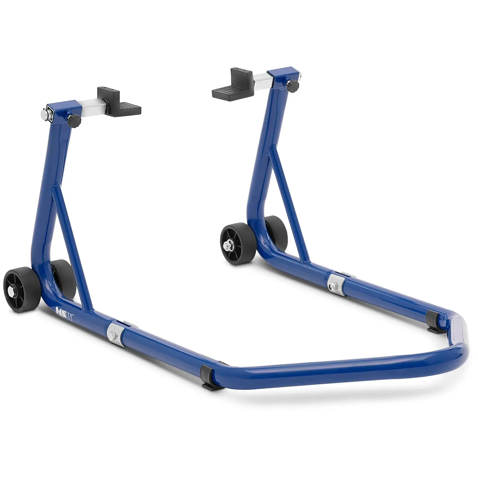 Takapyörä pukille ja huoltotyöt voivat alkaa! MSW:n moottoripyörätunkilla moottoripyrät on vaivatonta nostaa oikeaan asentoon huoltotöitä varten. Säädettävien kumitelojen ansiosta voit suorittaa huoltotöitä ja korjauksia monille eri malleille – ihanteellinen ammattikorjaamoihin. Kompakti pukki löytää kuitenkin paikkansa myös harrastajan autotallista. Voit helposti liu’uttaa pukin ajoneuvon alle sen 4 tukevalla muovipyörällä. Pitkä kahva lisää vipuvoimaa, joten nostat huollettavat moottoripyörät pukille nopeasti ja vaivattomasti. Huoltopukki on valmistettu kestävästä, jauhemaalatusta teräksestä. Ristituet tarjoavat lisävakautta sekä telineelle että moottoripyörälle. Moottoripyörän pukki kestää jopa 200 kg:n painon. Sininen pinnoite ja pukin materiaali ovat ruosteenkestäviä. Huoltopukin koko on 78 x 34,5 x 55 cm. Se sopii useille moottoripyörämalleille ja on helppo kuljettaa. Pukki sopiikin hyvin mihin tahansa autotalliin.