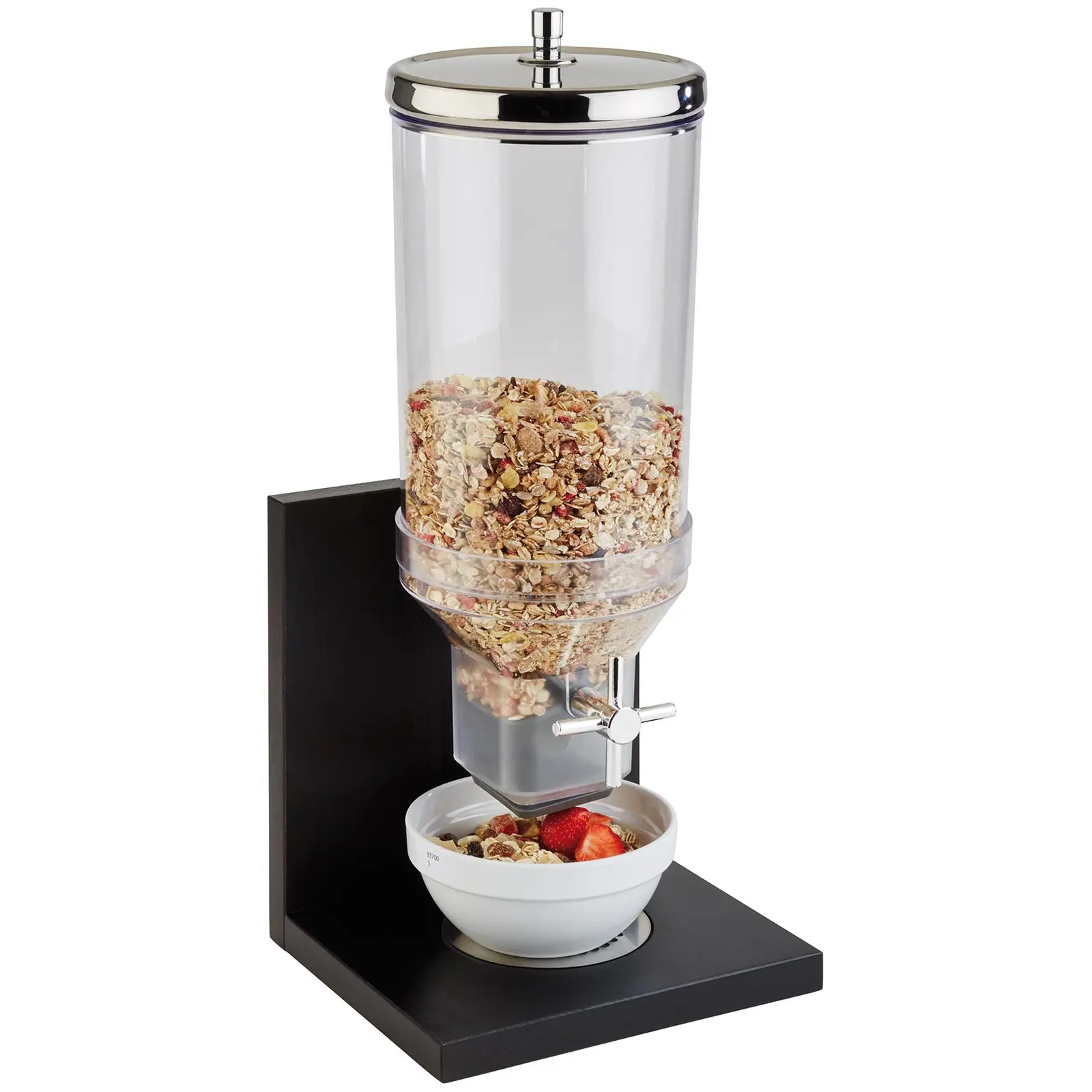 Hemmottele vieraasi aamiaisbuffetilla, joka sisältää tuoretta mysliä, muroja tai maissihiutaleita! Elegantin muroannostelijan säiliö on läpinäkyvä. Vieraasi näkevät heti, mitä saavat ja tiedät, milloin muroja on lisättävä. Muroannostelija on kiinnitetty puujalustaan, joka varmistaa vakauden. Tämä tarkoittaa, että annostelunokan alle mahtuu erityyppisiä kulhoja. Vieras voi itse päättää, kuinka paljon mysliä hän haluaa kulhoonsa kääntämällä kätevää annostelunokkaa. Säiliö on peitetty ruostumattomasta teräksestä valmistetulla tiiviillä kannella, jotta sisältö pysyy tuoreena buffetissa yön yli.