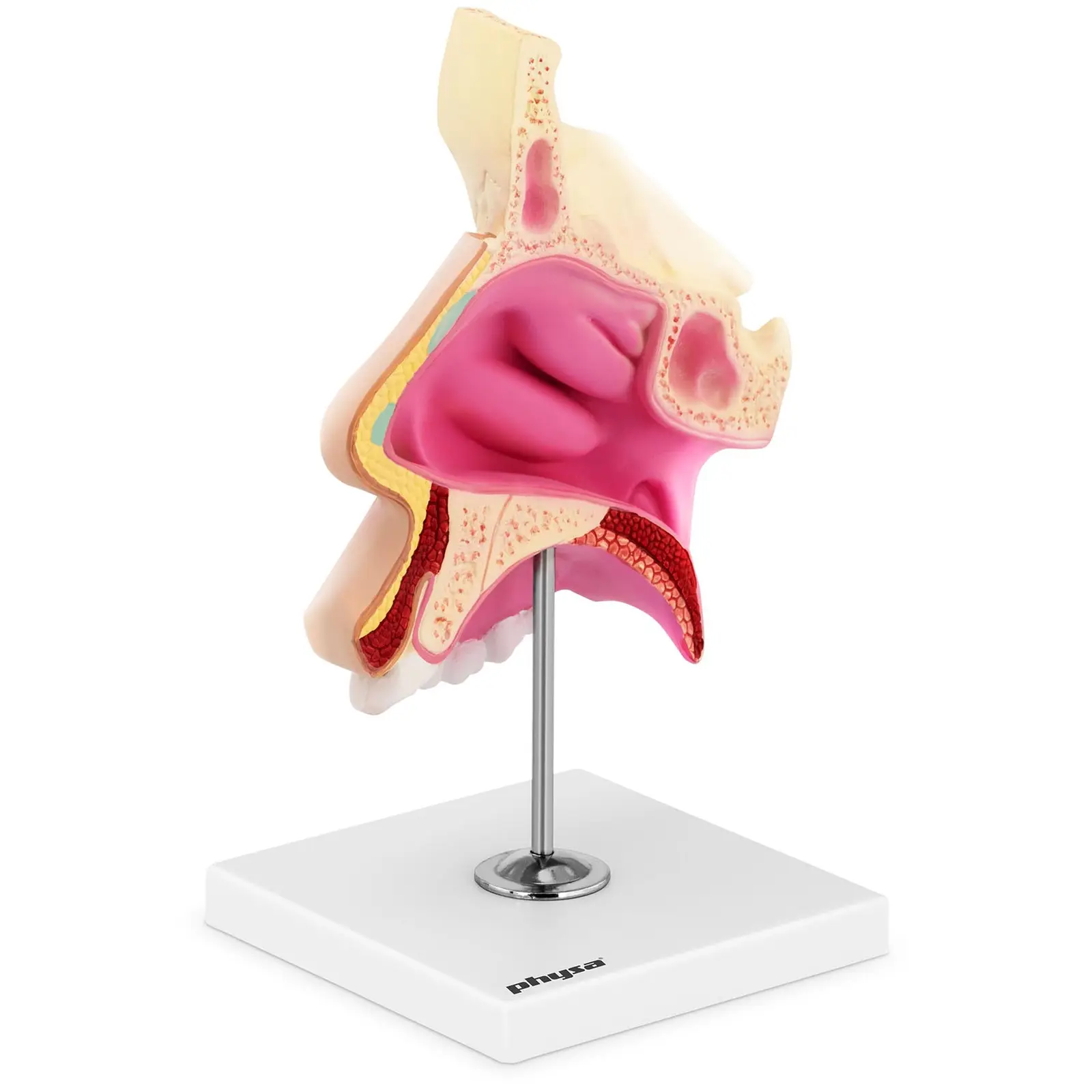 Physan kolmiulotteinen nenäontelon malli PHY-NM-1 täyttää kaikki odotuksesi realistiselle ihmisen anatomiselle mallille. Sen yksityiskohdat ovat kauttaaltaan tarkkoja ja huolellisesti väritetty. Tämä on ihanteellinen malli oppimiseen ja eri harjoitustehtäviin lääkärien vastaanotoille, sairaaloihin, kouluihin ja yliopistoihin. Tämän väritetyn lääketieteellisen mallin mittakaava on 1:1 ja se esittää ihmisen nenäontelon poikkileikkauksena. Se sisältää kaikki nenäontelon tärkeimmät osat, kuten otsaontelon, nenäkuorikot, nenän eteisen, kovan ja pehmeän suulaen, kitakielekkeen, kitarisan ja korvatorven. Anatominen malli seisoo vankasti tyylikkäällä jalustallaan. Malli auttaa ymmärtämään nenäontelon rakennetta ja on niin selkeä, että se ei saisi puuttua yhdenkään korva-, nenä- ja kurkkutautien erikoislääkärin vastaanotolta! Kaikki physan anatomiset mallit ovat luotettavaa laatua. Tärkeät toiminnot ja sairaudet on helppo havainnollistaa 3D-mallilla. Aidon näköinen anatominen malli auttaa ymmärtämisessä ja oppimisessa ja sen kolmiulotteisuus nenäontelon tarkassa analysoimisessa. Kevyen erikoismuovin ansiosta tämä malli vaikuttaa erityisen luonnolliselta. Tämän helppohoitoisen mallin vankka rakenne on todiste sen korkeasta laadusta.