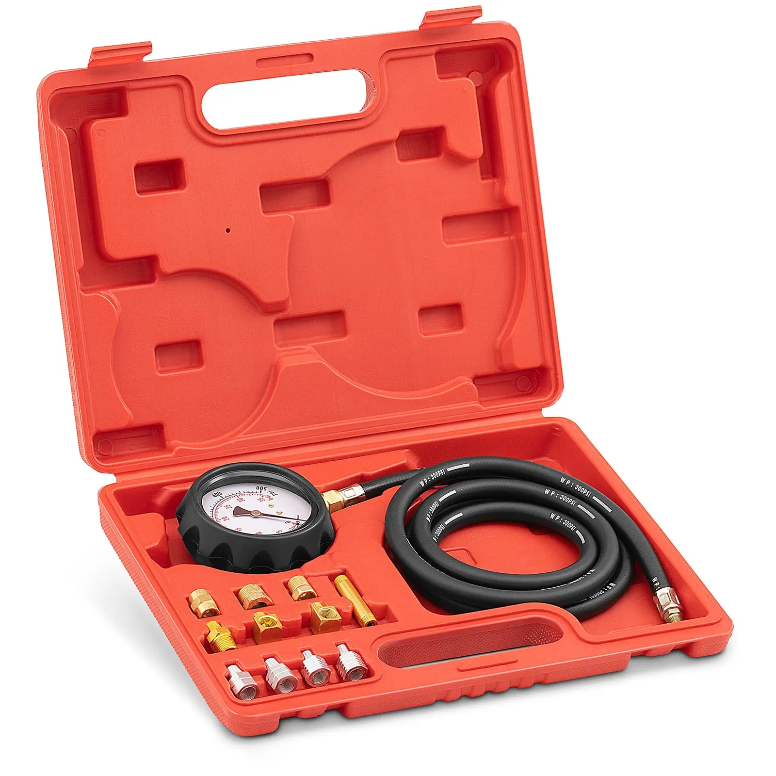 MSW:n öljynpainemittarisarjalla havaitset virheet ennen kuin ne aiheuttavat vakavia vauriota moottoriin. Laite näyttää öljynpaineen käytön aikana: Jos näyttöön ilmestyy normaaleista poikkeavia arvoja, viittaa se häiriöihin, kuten kuluneeseen öljypumppuun, vaurioituneeseen öljypainekatkaisimeen tai paineen hälytysindikaattoreihin. Kattavien varusteidensa ansiosta tämä ajoneuvotyökalu on käytettävissä kaikkiin yleisiin automerkkeihin ja -tyyppeihin ja se on täten ihanteellinen autokorjaamoihin tai intohimoisille autoharrastelijoille. Suuressa manometrissa on kaksoisasteikko, joka näyttää mittausarvot selkeästi baareina ja paunoina. Öljypainemittarisarjan mittausalue on 0 – 35 bar tai 0 – 500 psi. ±2,5 % tarkkuudella öljynpainemittari antaa tarkkaa tietoa mahdollisista häiriöistä. 1,80 m pitkän, joustavan letkunsa ansiosta on öljypainemittarin yhdistäminen sekä mittausarvojen lukeminen ongelmatonta ja mahdollisimman mukavaa. Toimituksen sisältöön kuuluu yksitoista erilaista adapteria, joilla mittari voidaan liittää kaikkiin yleisimpiin automalleihin. Luotettavaa öljynpainemittarisarjaa voidaan säilyttää kätevässä salkussa, joten mittausten jälkeen laitteen kuljetus ja varastointi onnistuu vaivattomasti.