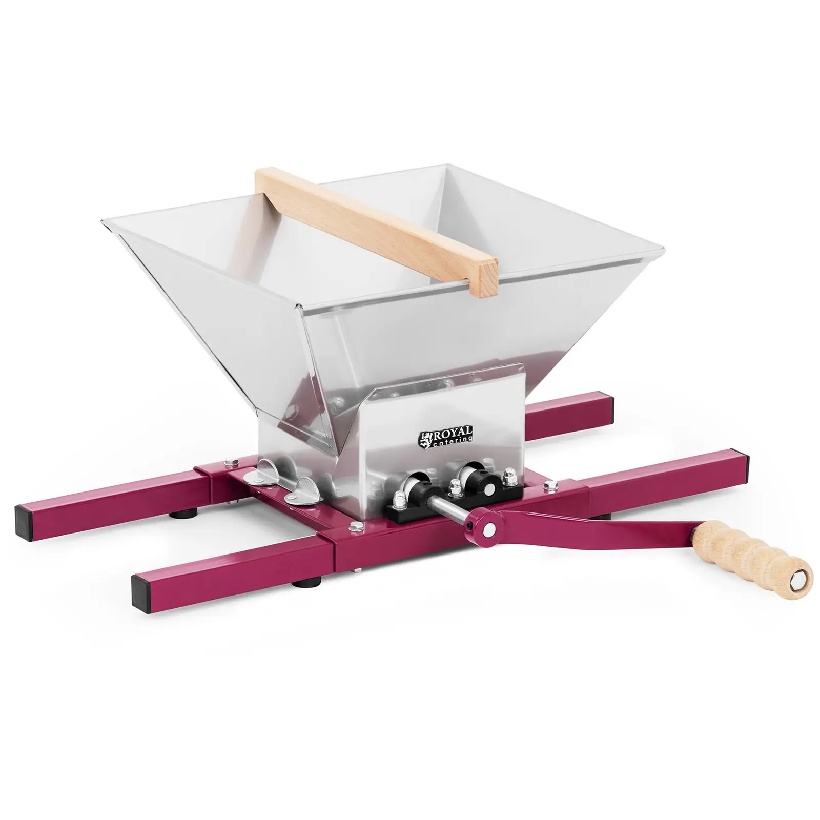 Royal Cateringin ravintolatarvikkeisiin kuuluvan RCWP-7CR-manuaalisen omenamurskaimen avulla voidaan pienentää helposti suuria määriä hedelmiä ja valmistaa ne näin mehun puristamista varten. Erityisen silppurin ansiosta pienet palat pysyvät erityisen mehukkaina ja ovat optimaalisen kokoisia jatkokäsittelyä varten. Valikoiman mehupuristimia kotitekoisten mehujen valmistusta varten löydät myymälämme keittiöväline-kategoriasta. Hedelmämurskain voidaan koota muutamalla yksinkertaisella vaiheella ja tarjoaa pienestä koostaan huolimatta erityisen suuren täyttötilavuuden. 33,5 x 30,5 cm:n täyttösuppilon ansiosta omenat, päärynät tai muut hedelmät voidaan työstää nopeasti suurina määrinä. Suurimmasta osasta hedelmiä ei tarvitse edes poistaa siemeniä; persikoista, kirsikoista, nektariineista, aprikooseista, luumuista ja vastaavista hedelmistä on kuitenkin poistettava kova sisäosa. Suuret hedelmät tulisi jakaa puolittaa ja pilkkoa neljäsosiin; pienet hedelmät voidaan murskata kokonaisina. Erityisen suuri ja ergonominen kahva mahdollistaa vähävaivaisen hedelmämurskaimen käytön käynnin aikana. Muovipäällysteiset jalat suojaavat lattiaa ja varmistavat lisäksi, että laite seisoo tukevasti. Manuaalisen käytön ansiosta hedelmämurskain on ihanteellinen minne tahansa, missä sähkö on vaikeasti tai ei lainkaan saatavilla. Hedelmämurskain on suunniteltu pitkäaikaiseen käyttöön. Raudasta, alumiinista ja ruostumattomasta teräksestä valmistettu kestävä rakenne mahdollistaa käytön monien vuosien ajan. Alumiinimurskaimen suunnittelussa on panostettu sen tehokkuuteen, mikä takaa pienennettyjen aineosien optimaalisen ja mehukkaan koostumuksen.